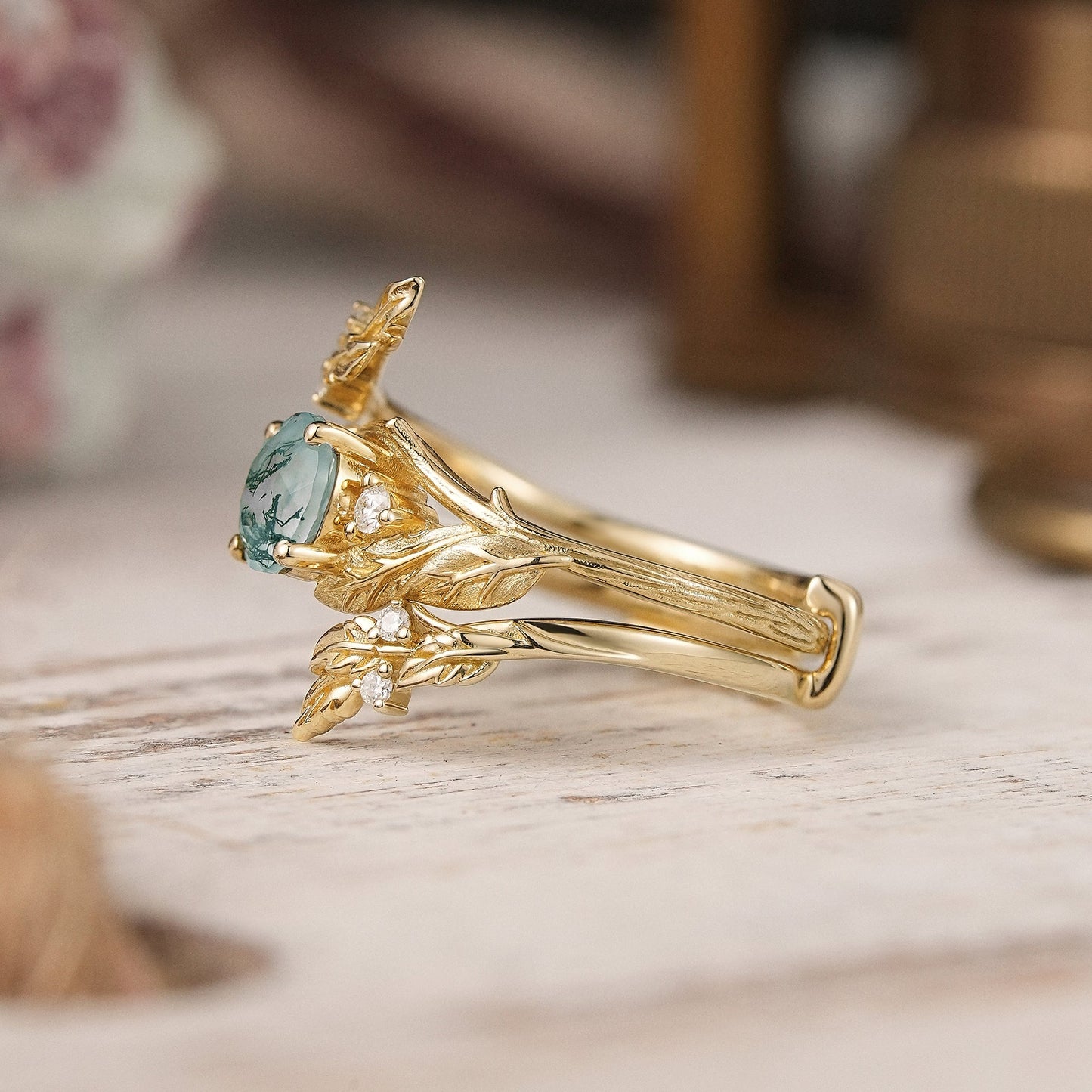 Bark Textured Round Cut Moss Agate Nature Inspired Enhancer Bridal Ring Set