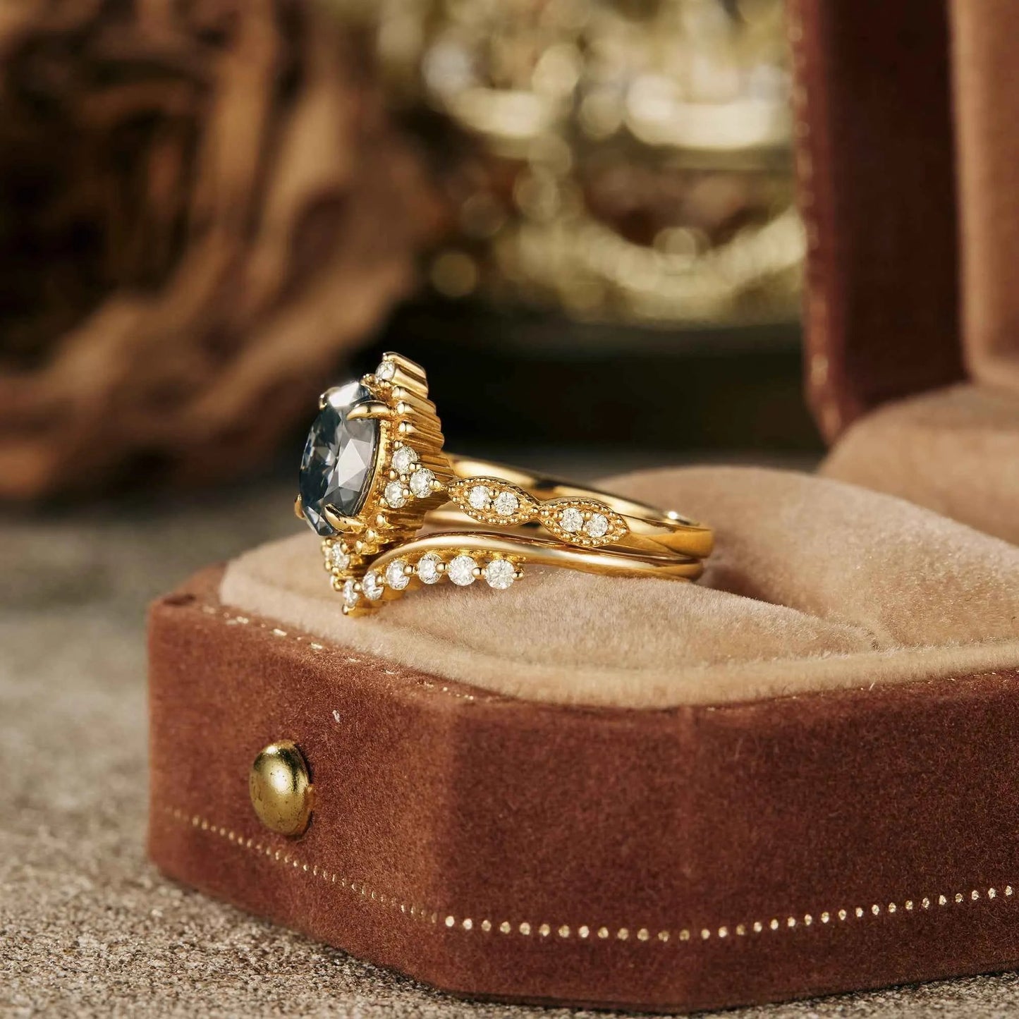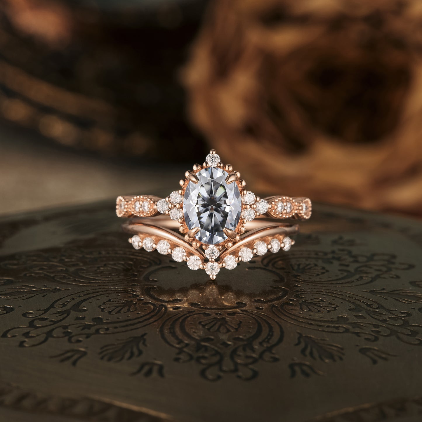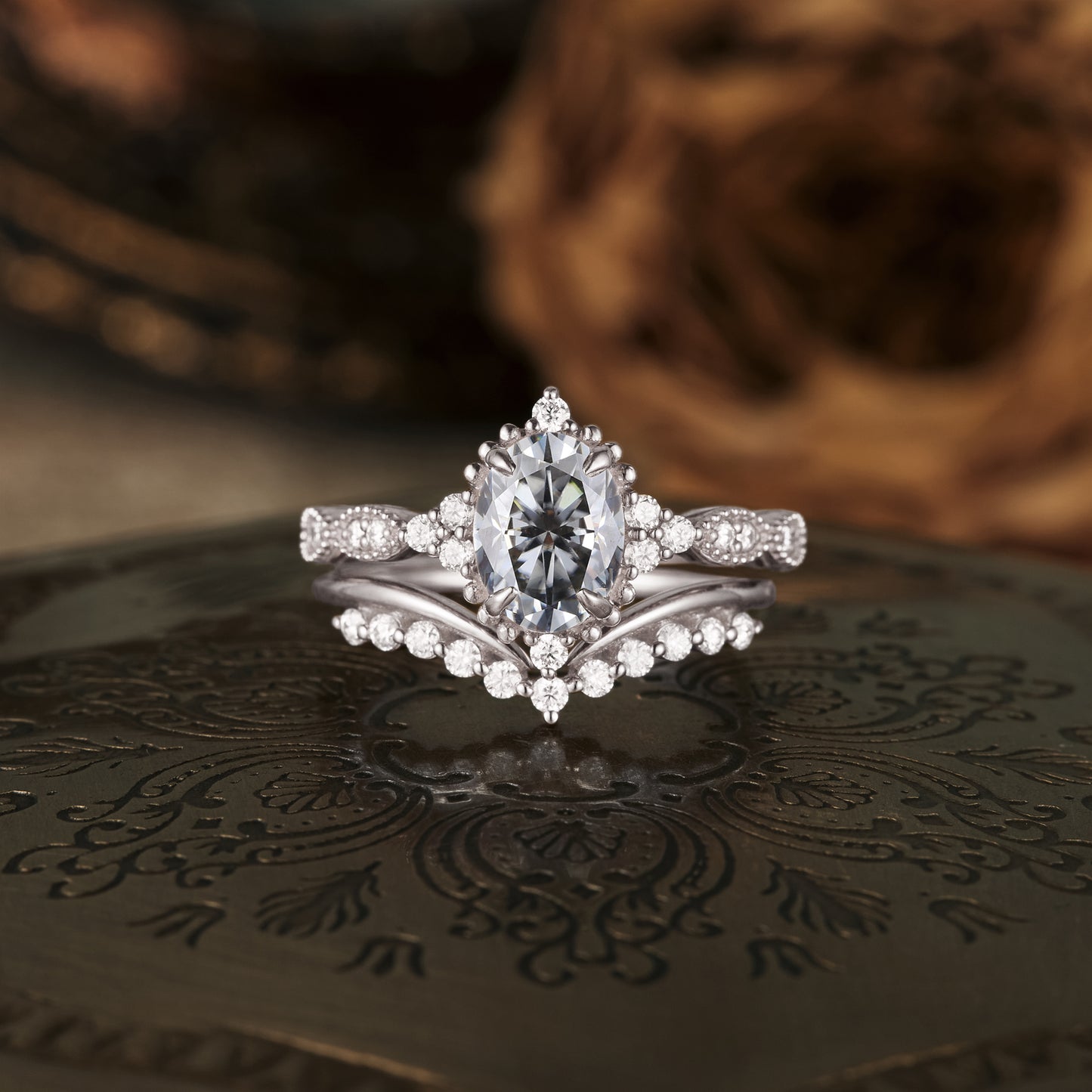 This ring set features oval gray moissanite as the centerpiece, elegantly complemented by round moissanite accents on both the engagement ring and wedding band.