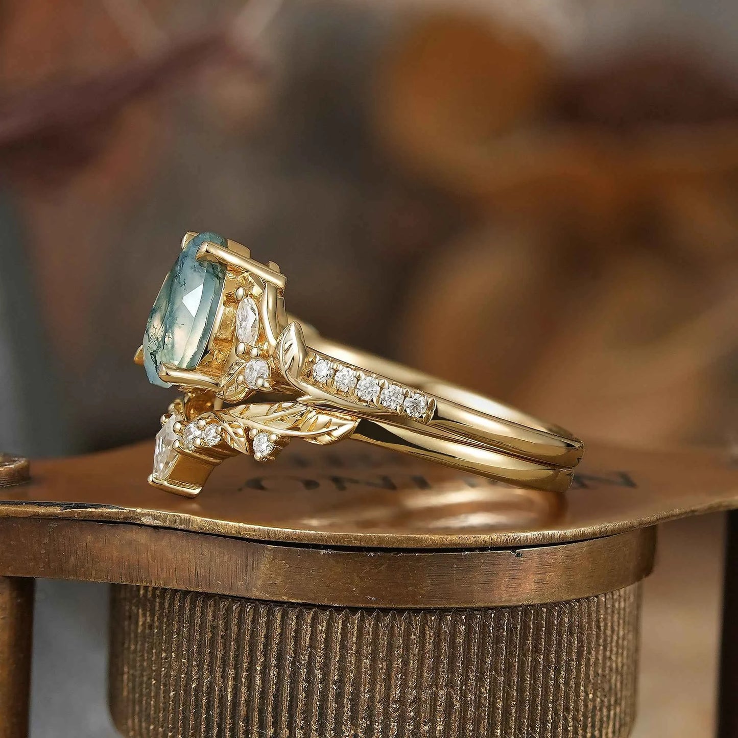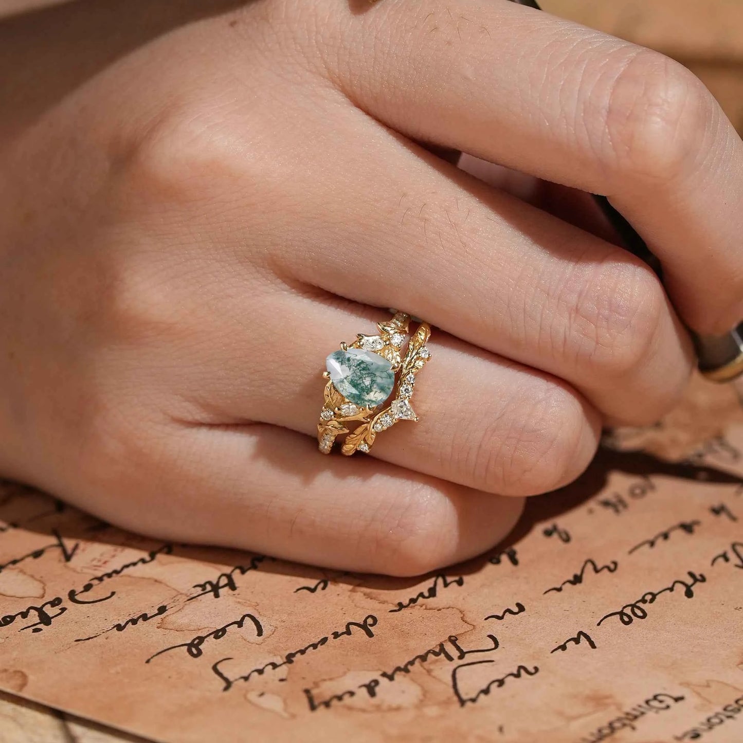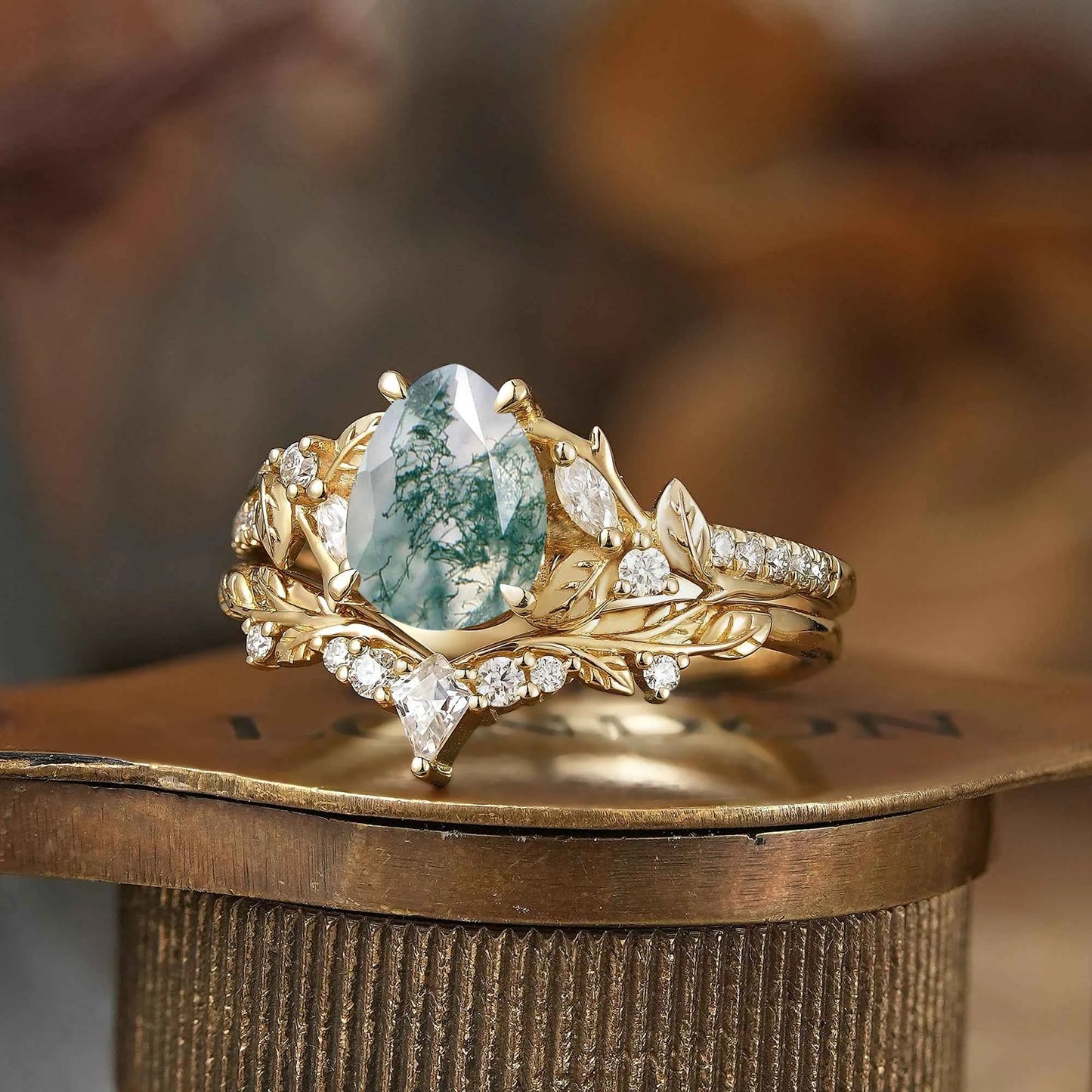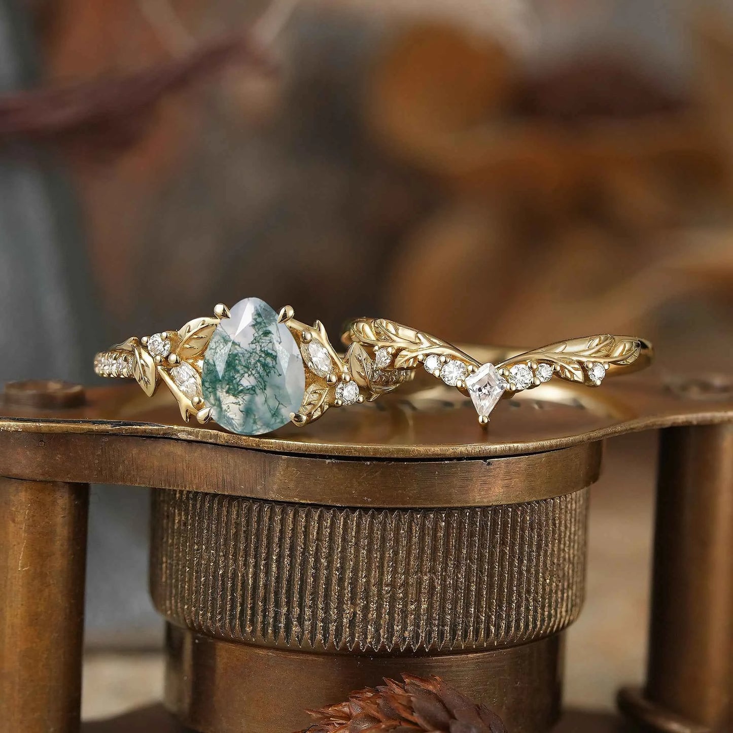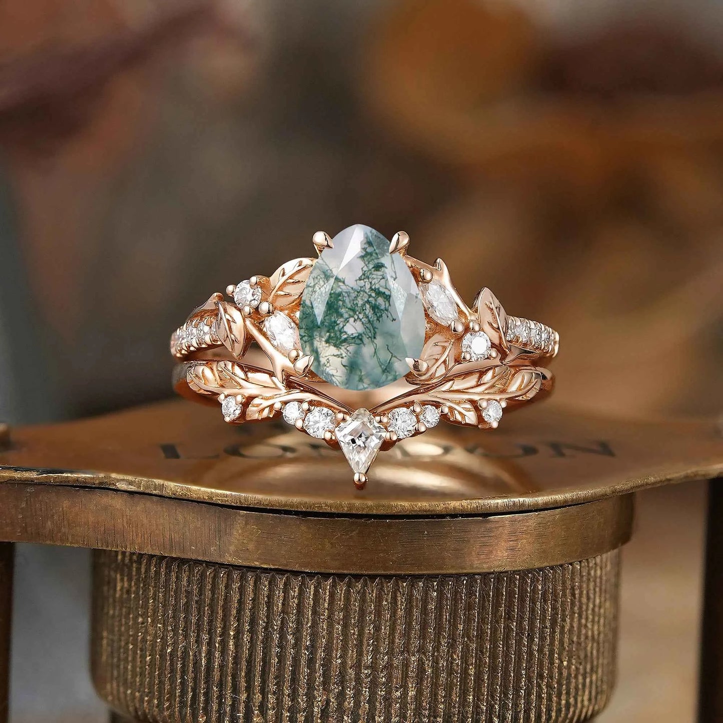 Pear Cut Moss Agate Leaf Inspired Bridal Ring Set - Holly