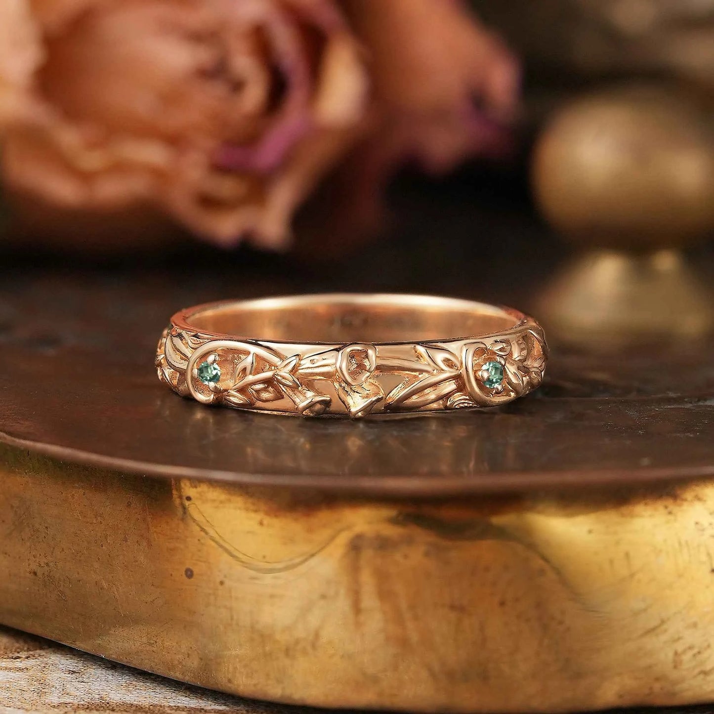 Delicate and graceful, this green sapphire wedding band is inspired by blooming foxglove flowers, with intricate floral details flowing along the band. Accented with green sapphires, the design captures a soft, organic elegance.