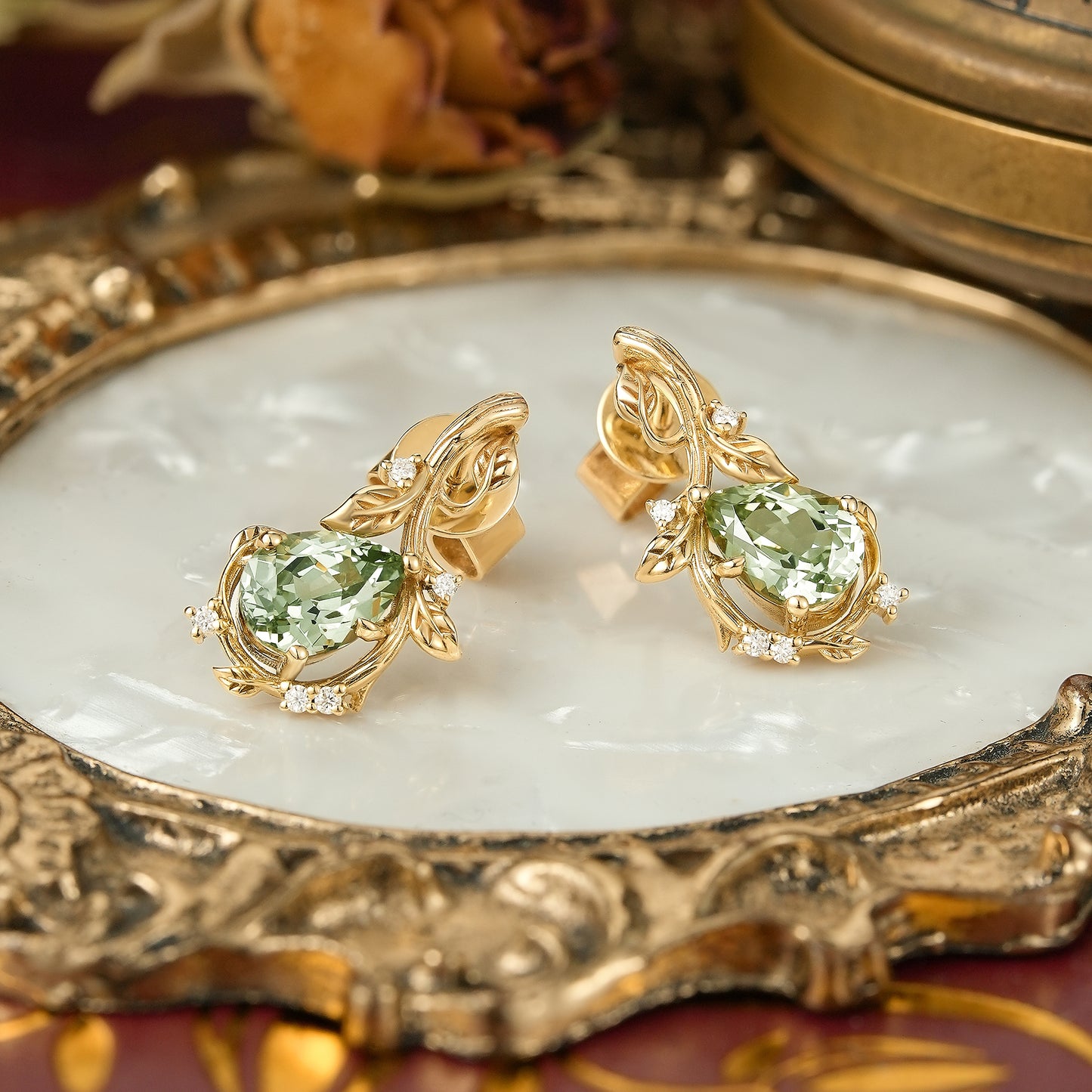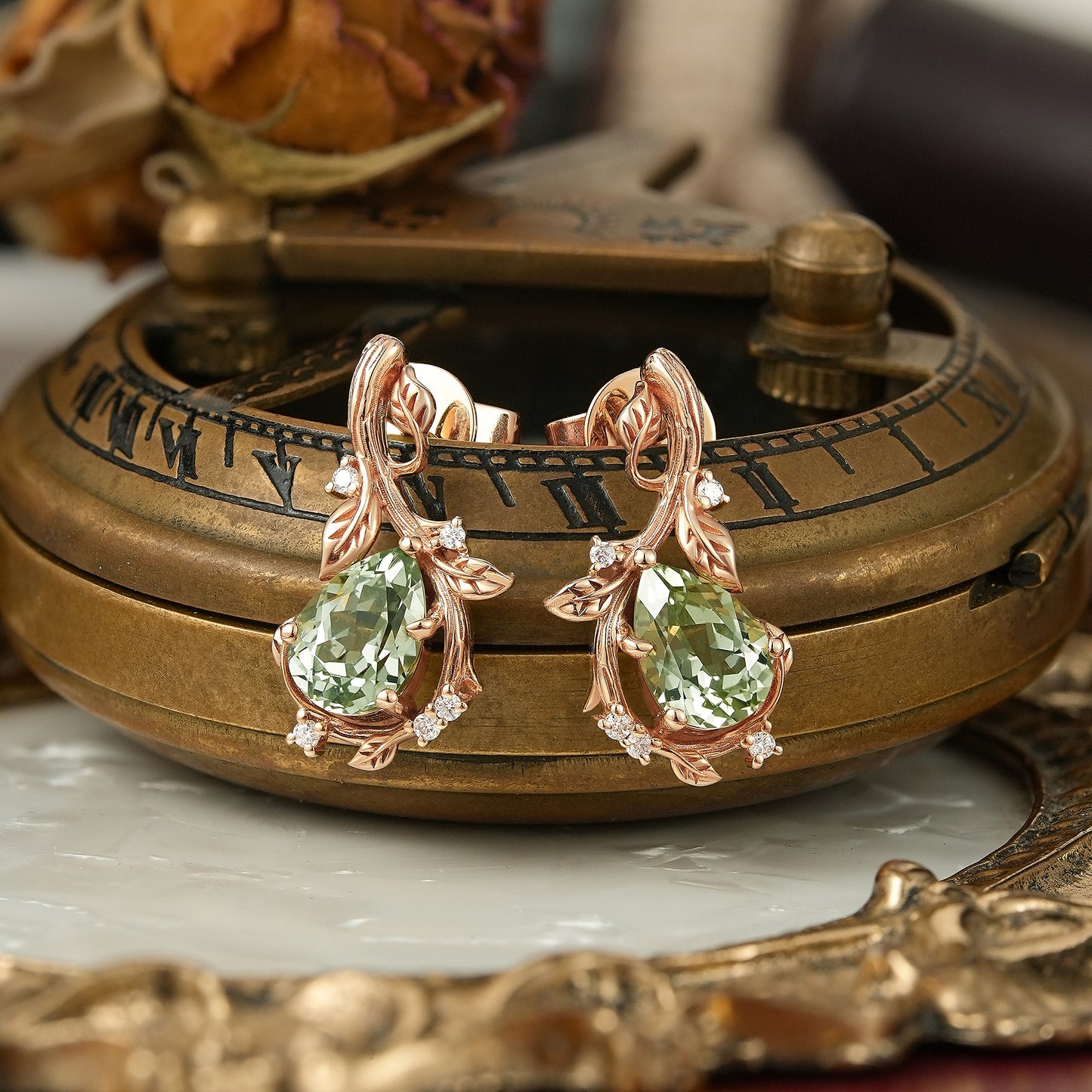 Nature Inspired Pear Green Sapphire Leaf And Bark Textured Earrings - Edith