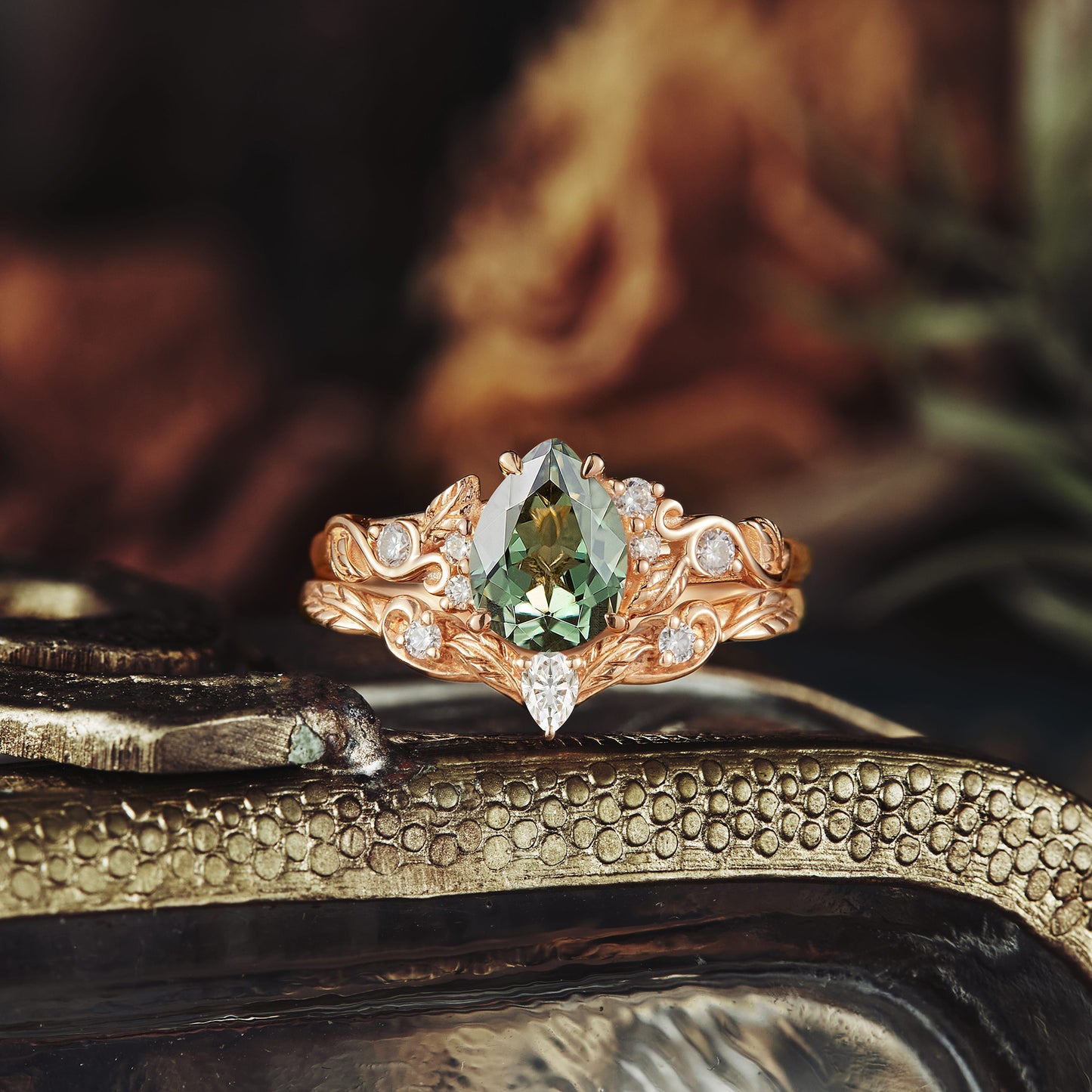 Nature's Embrace: Green Sapphire Leaf Ring Set - Felicity