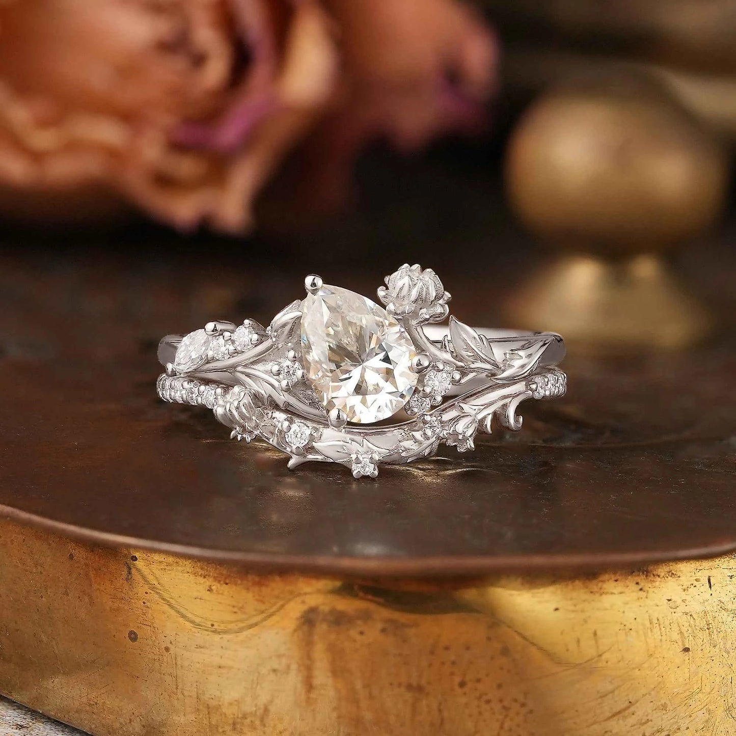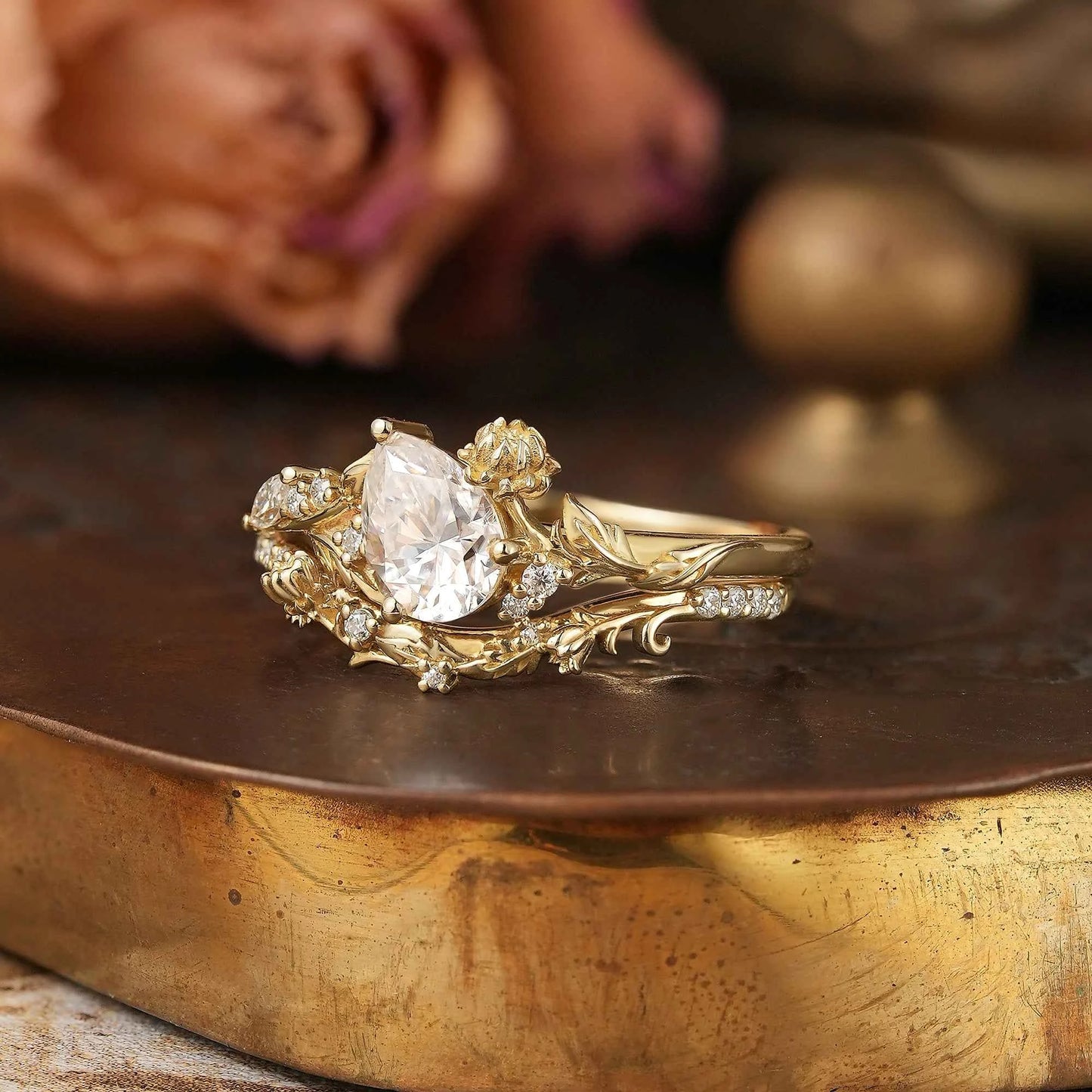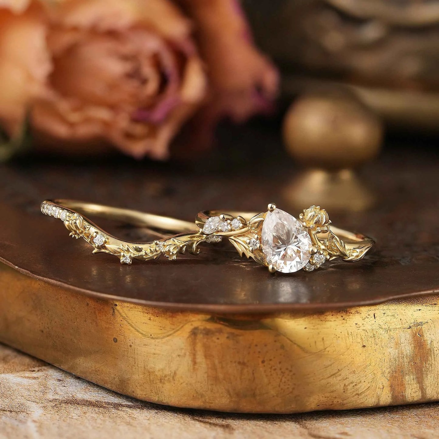 Pear Cut Moissanite Snow Lotus Inspired Bridal Ring Set - Lucia