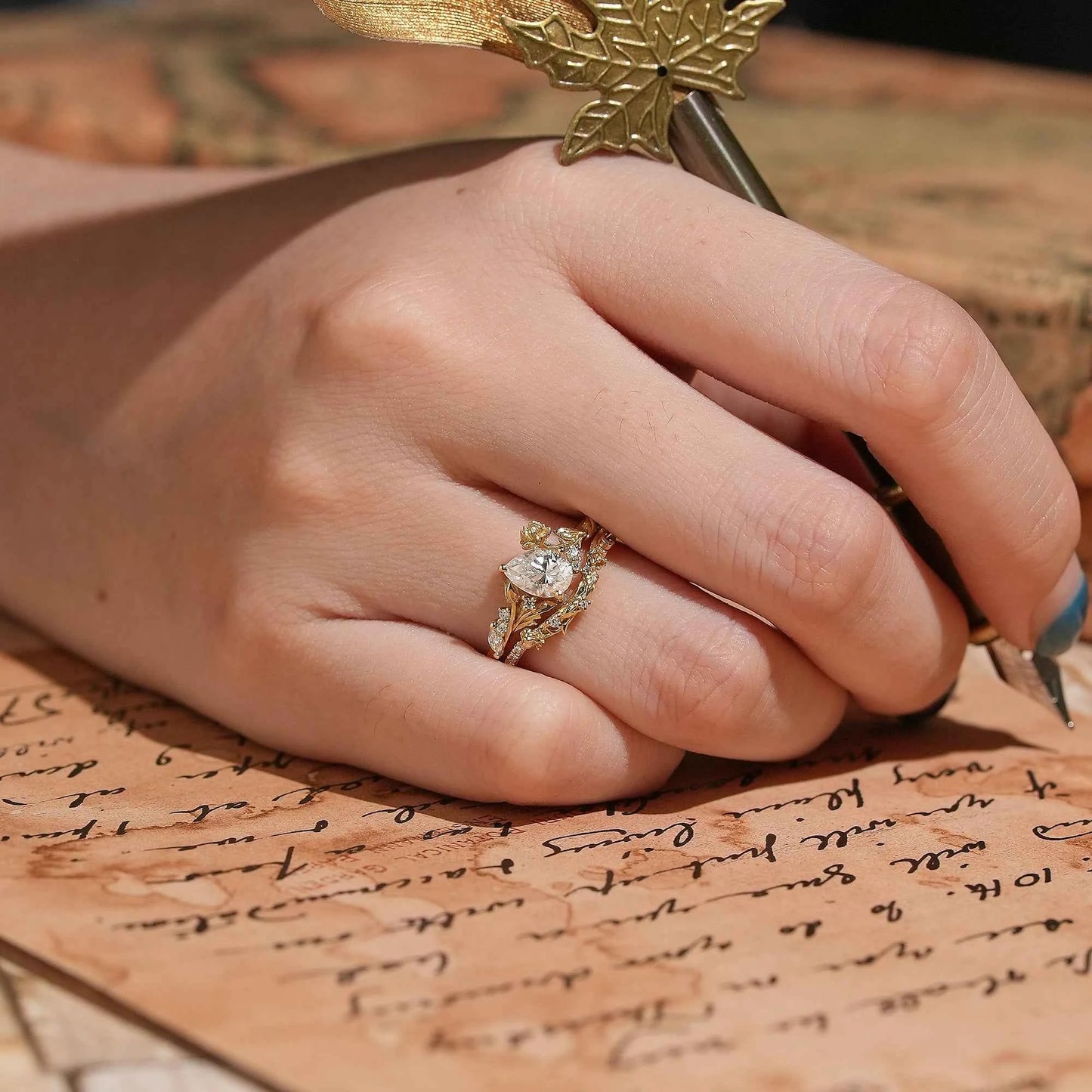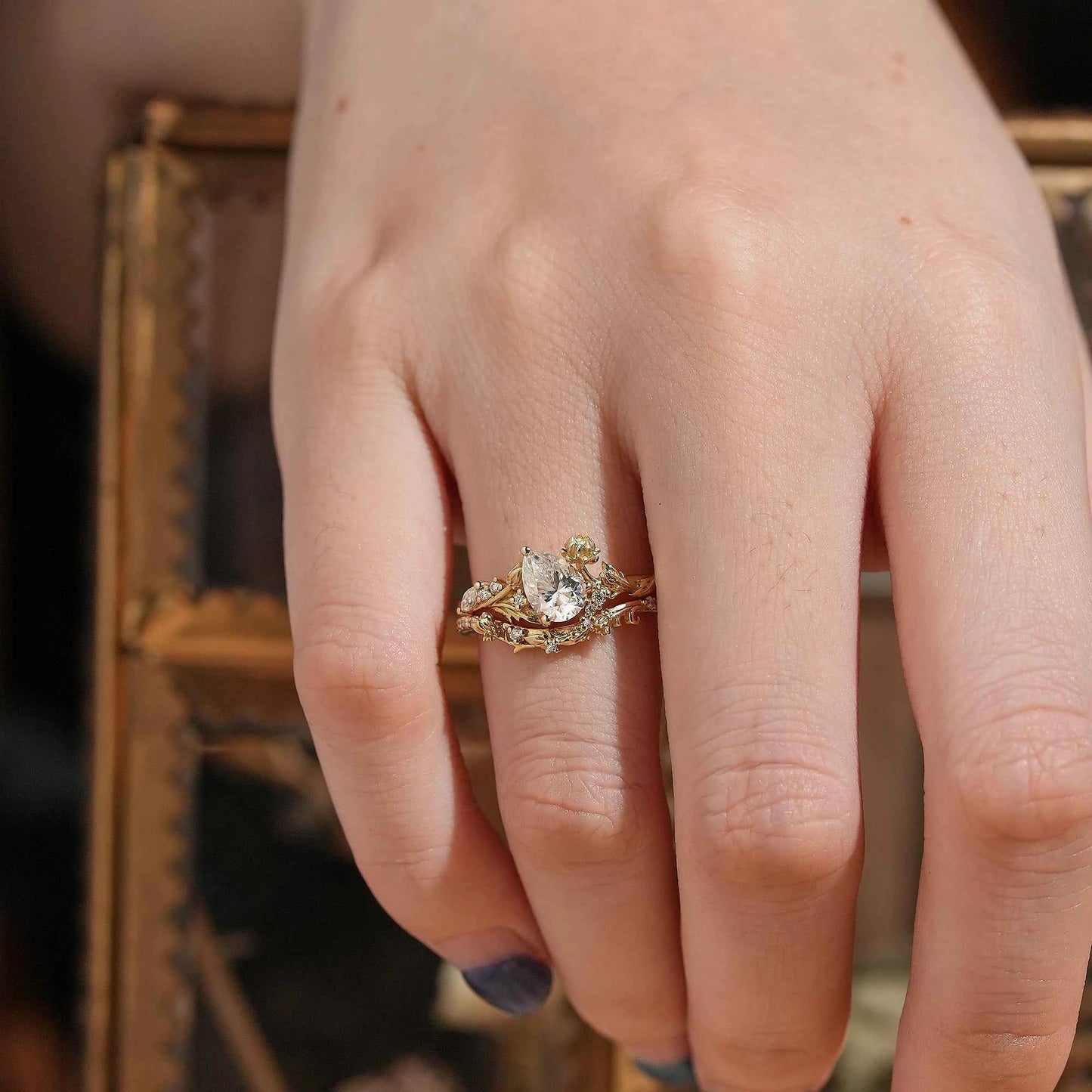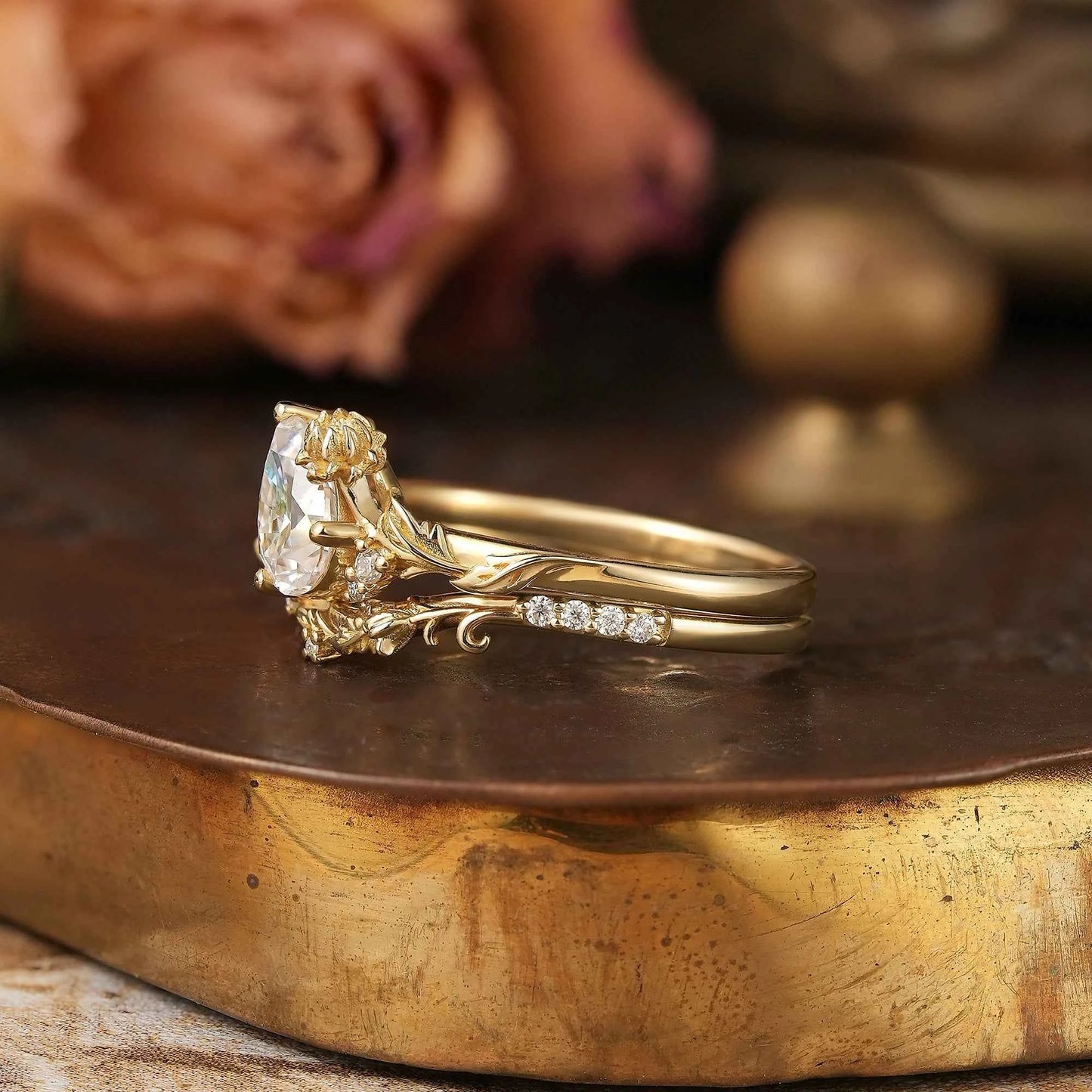 Pear Cut Moissanite Snow Lotus Inspired Bridal Ring Set - Lucia