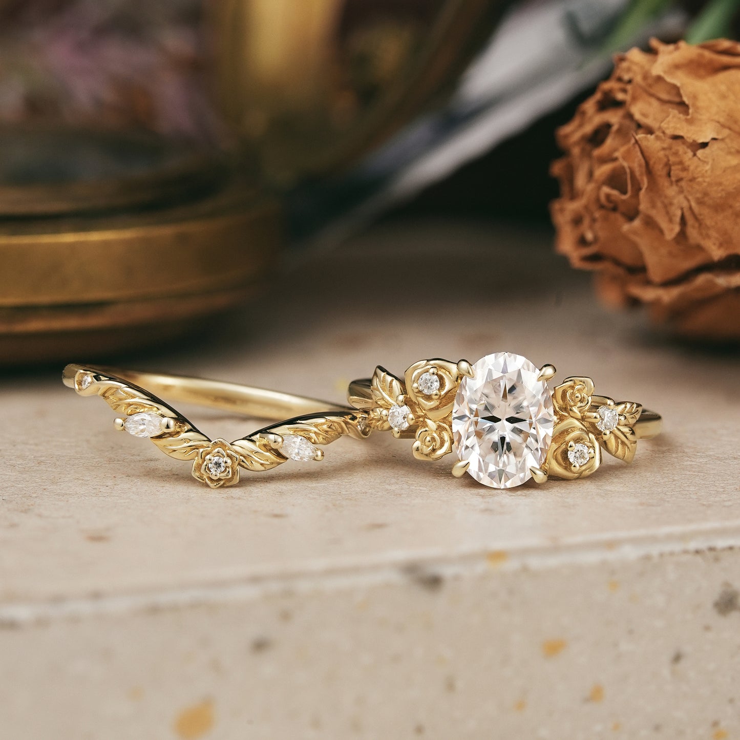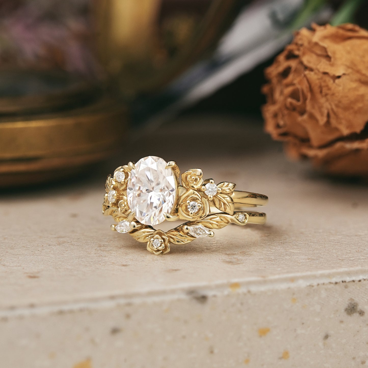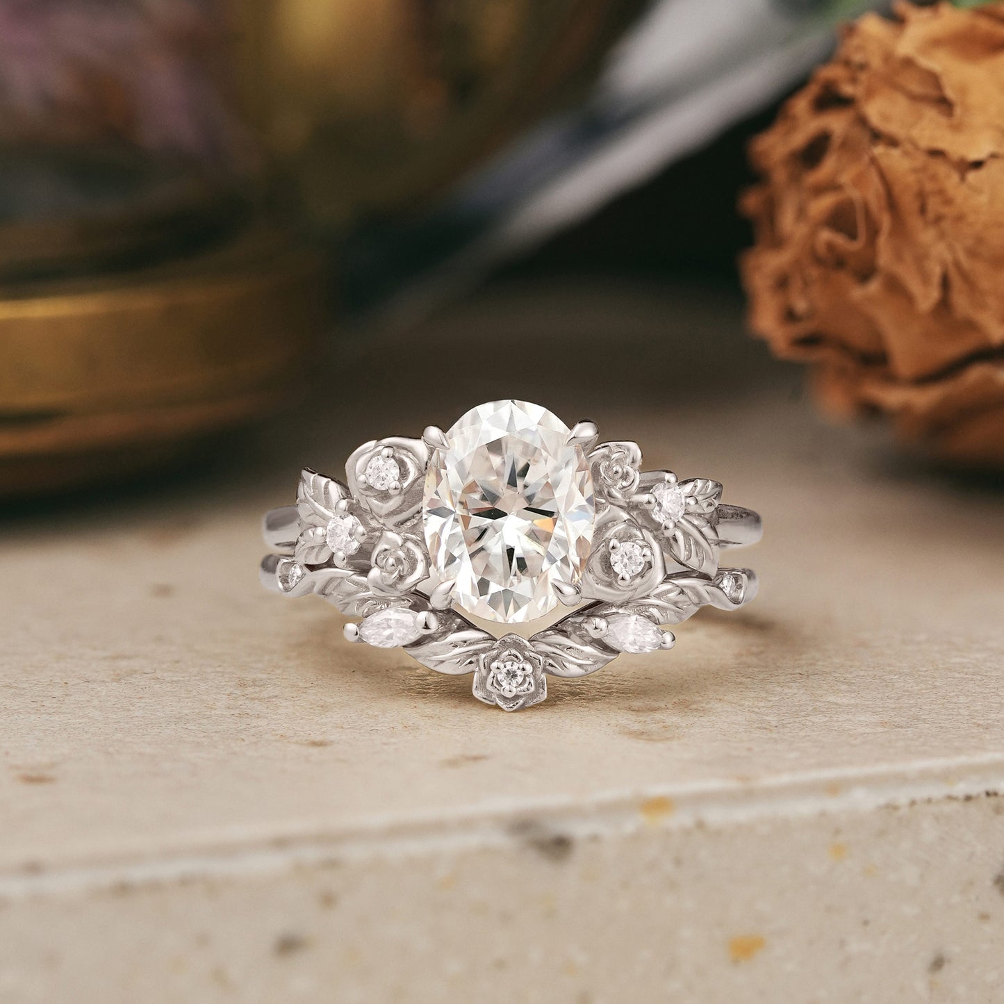 Rose Inspired Oval Cut Moissanite Flower Bridal Ring Set - Donna
