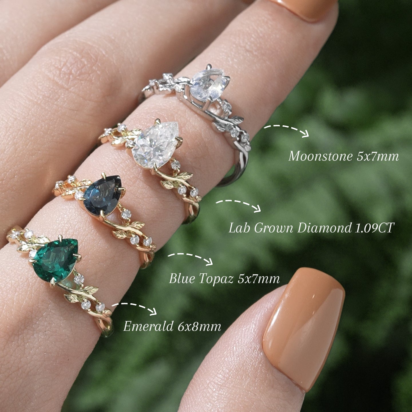 Celebrate your ever-growing love with this elegant leaf engagement ring, centered with a pear-cut green sapphire symbolizing renewal, growth, and inner peace. Inspired by the Elven Garden, its delicately handcrafted leaf motifs capture the timeless magic of nature.
