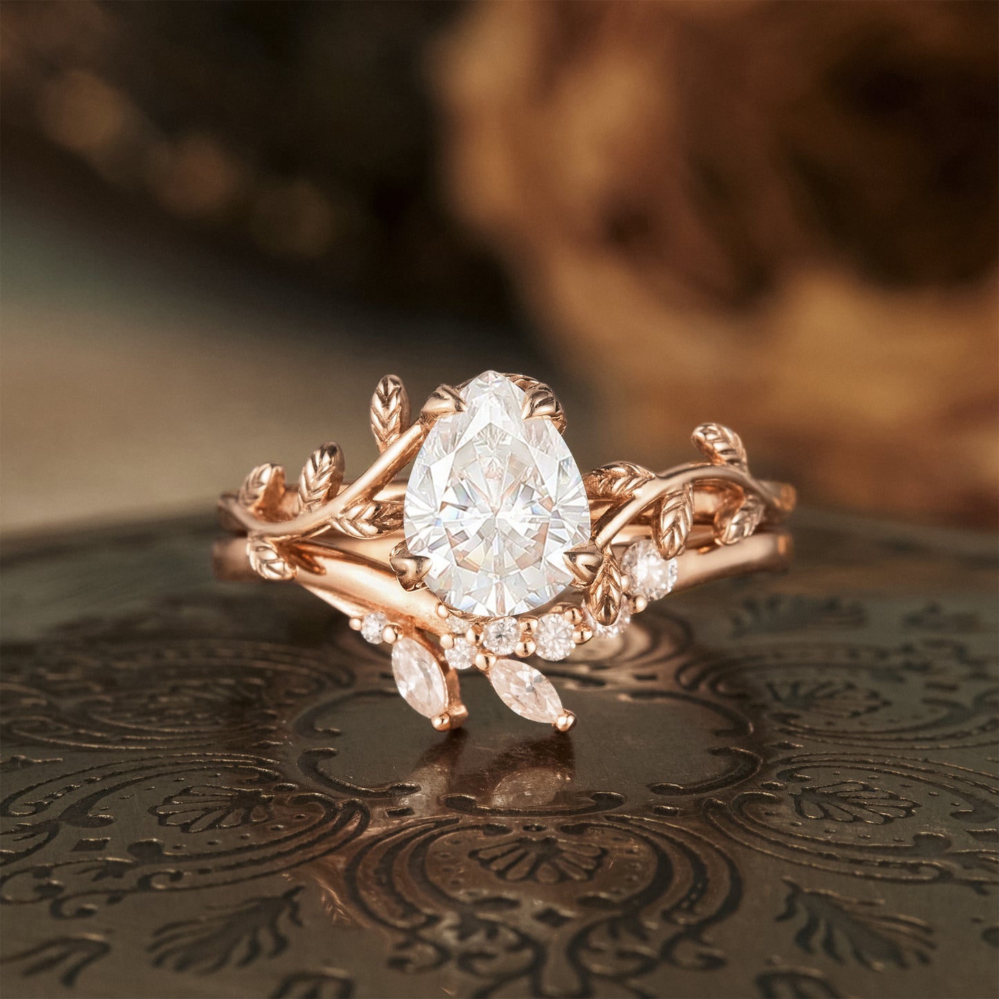 This nature-inspired ring with leaf motif detail is from an apple blossom. It symbolizes favoritism. Signature handcrafted details include see-through moissanites and milgrain texture.