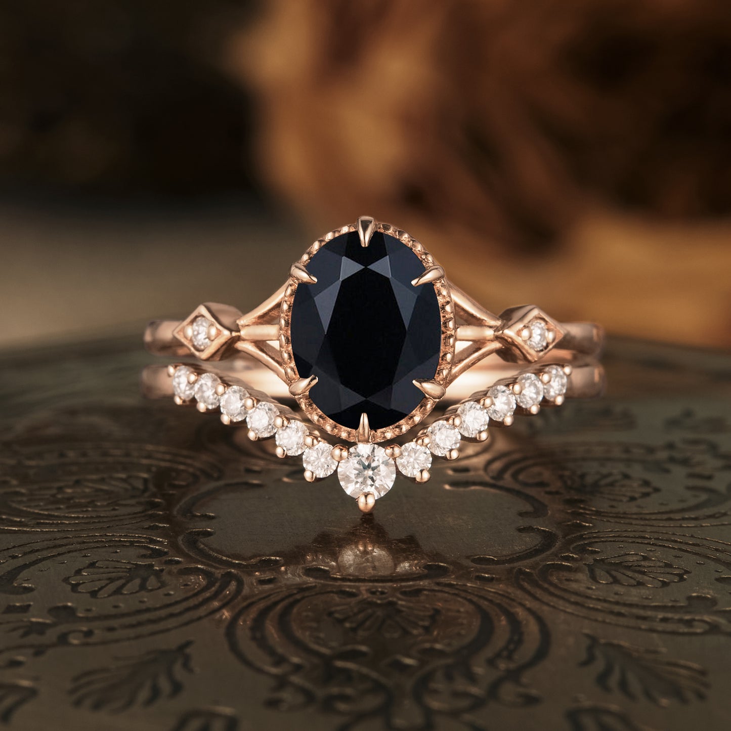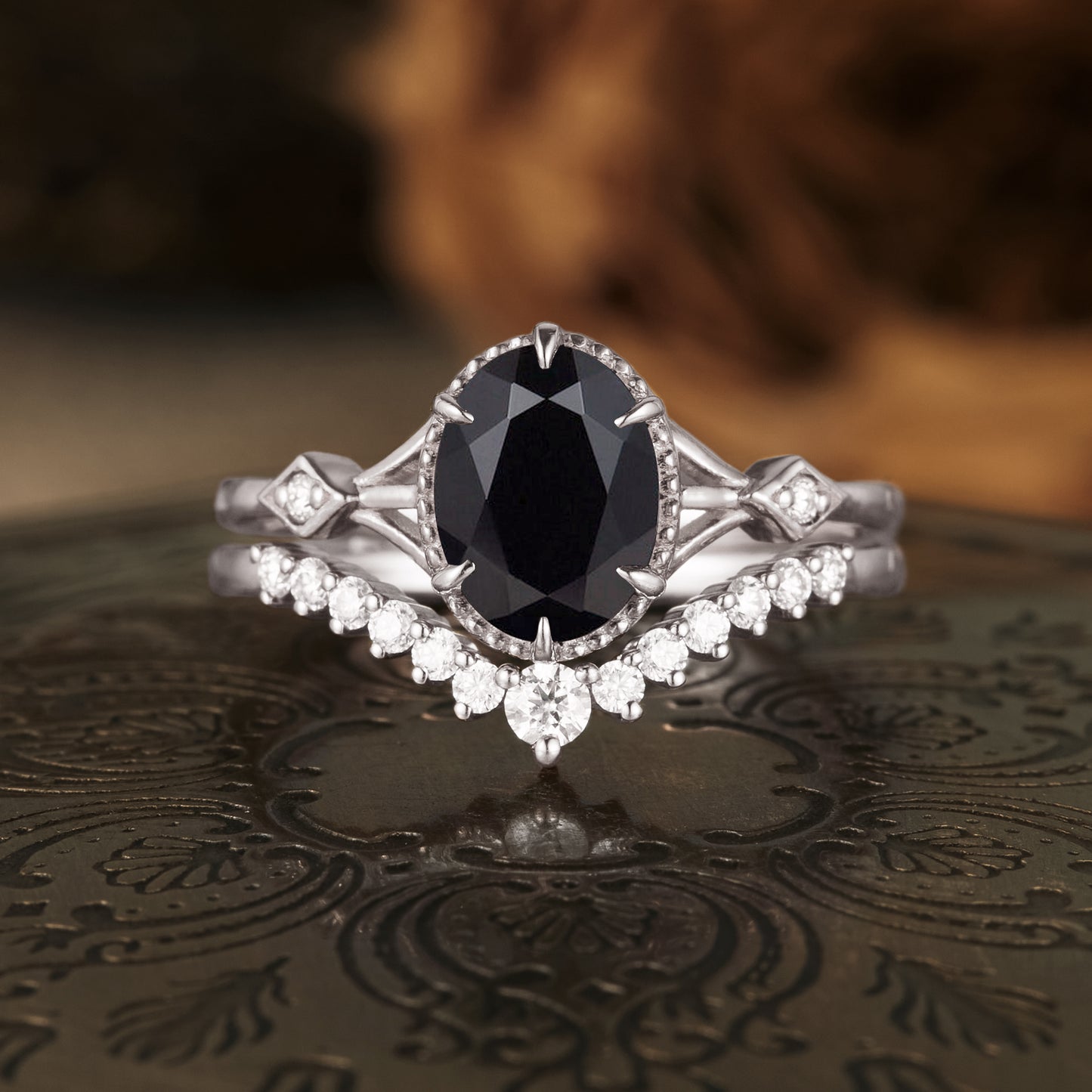 The centerpiece of the engagement ring is a stunning oval black onyx, known for its deep, rich color and smooth finish. The accompanying wedding band is thoughtfully designed to complement the engagement ring. It features a row of V-shaped moissanite stones, each meticulously set to enhance the brilliance and sparkle of the band.