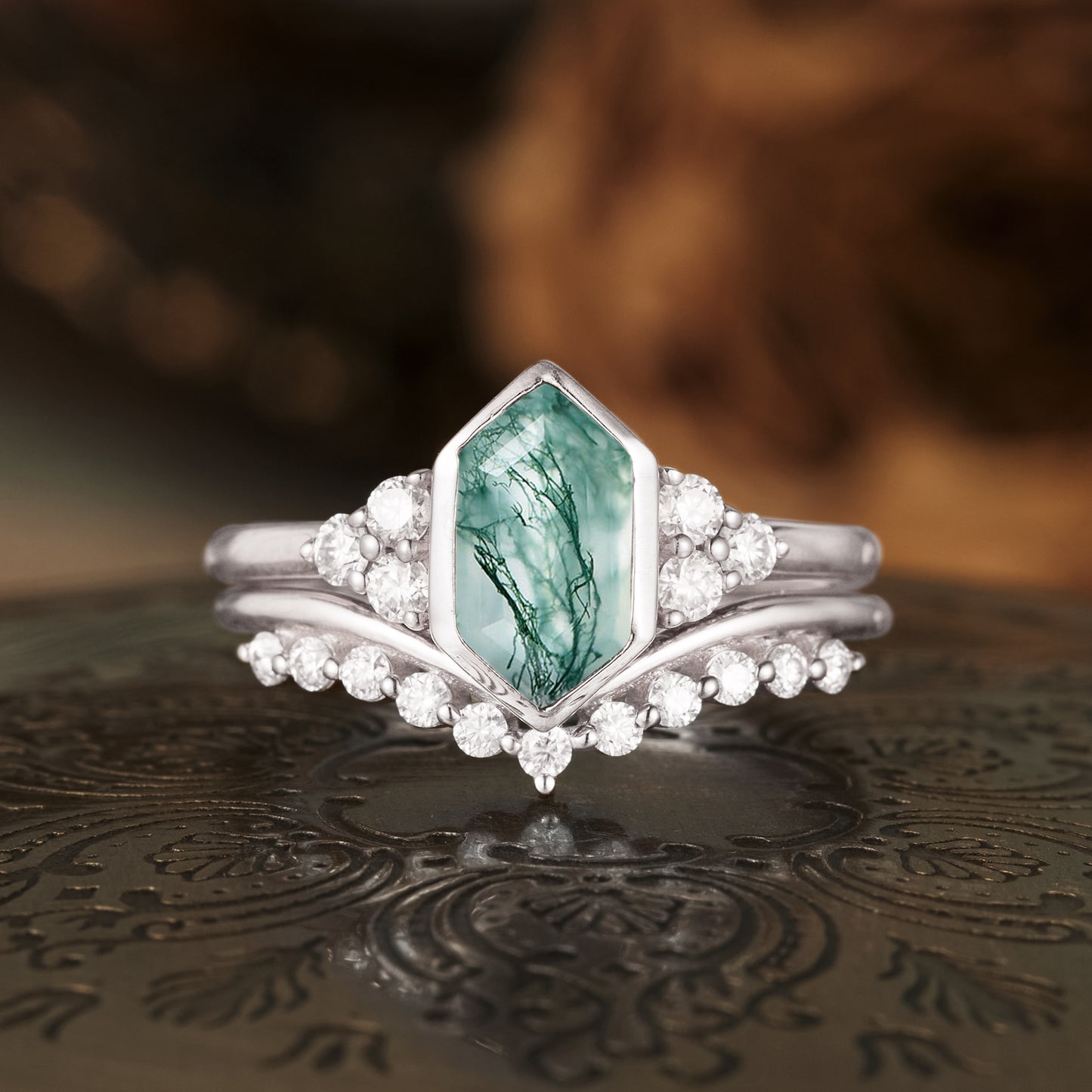Vintage Moss Agate Engagement Ring Set 2pcs - GemsMagic
