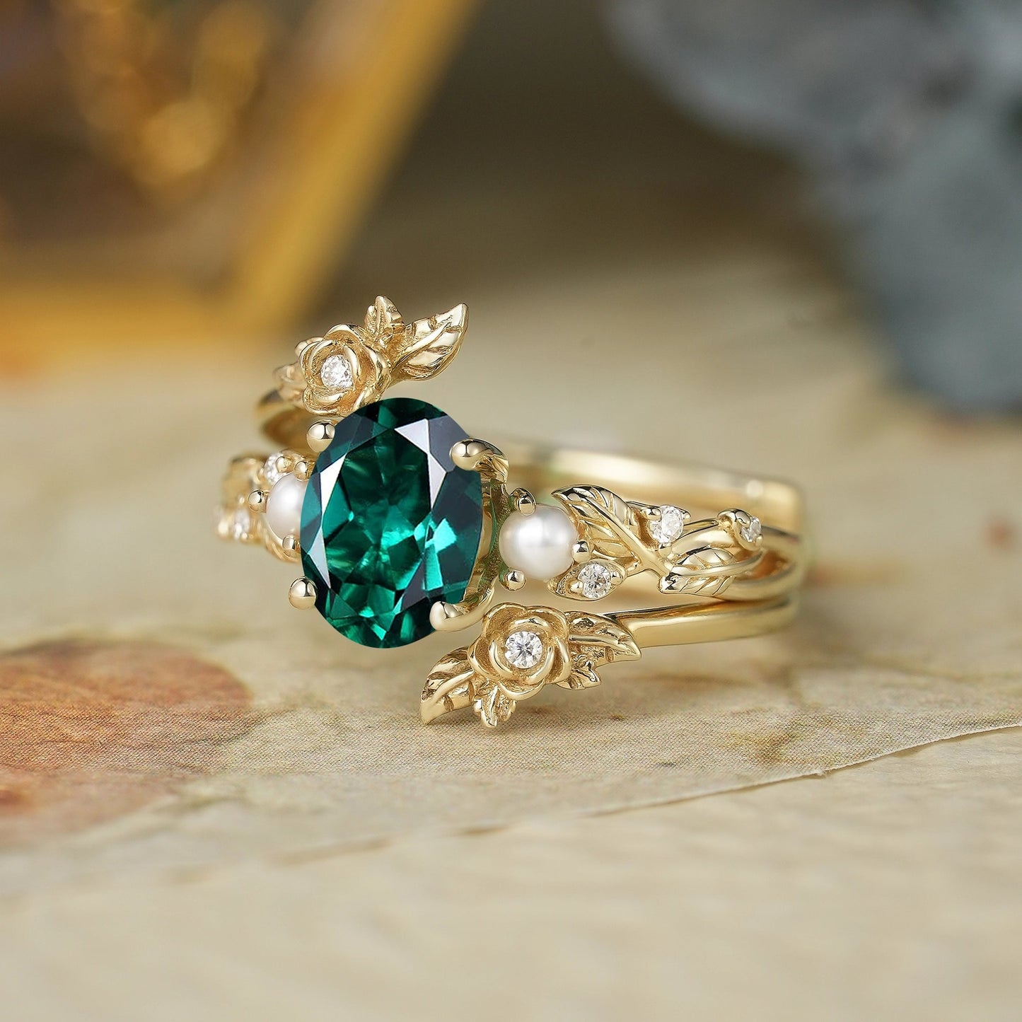 Oval Cut Emerald Ring - Rose Blossom Vine Ring Set | Tessa
