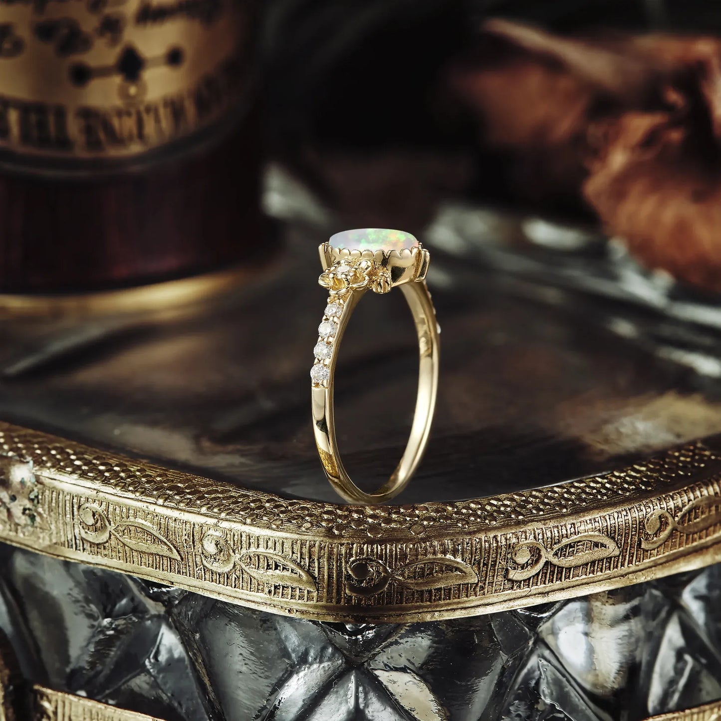 "Hera's Opal Garden" showcases a captivating opal embraced by intricate floral and leafy designs. The golden band, adorned with sparkling moissanites, enhances the ethereal beauty of the opal, creating a harmonious blend of nature and elegance.