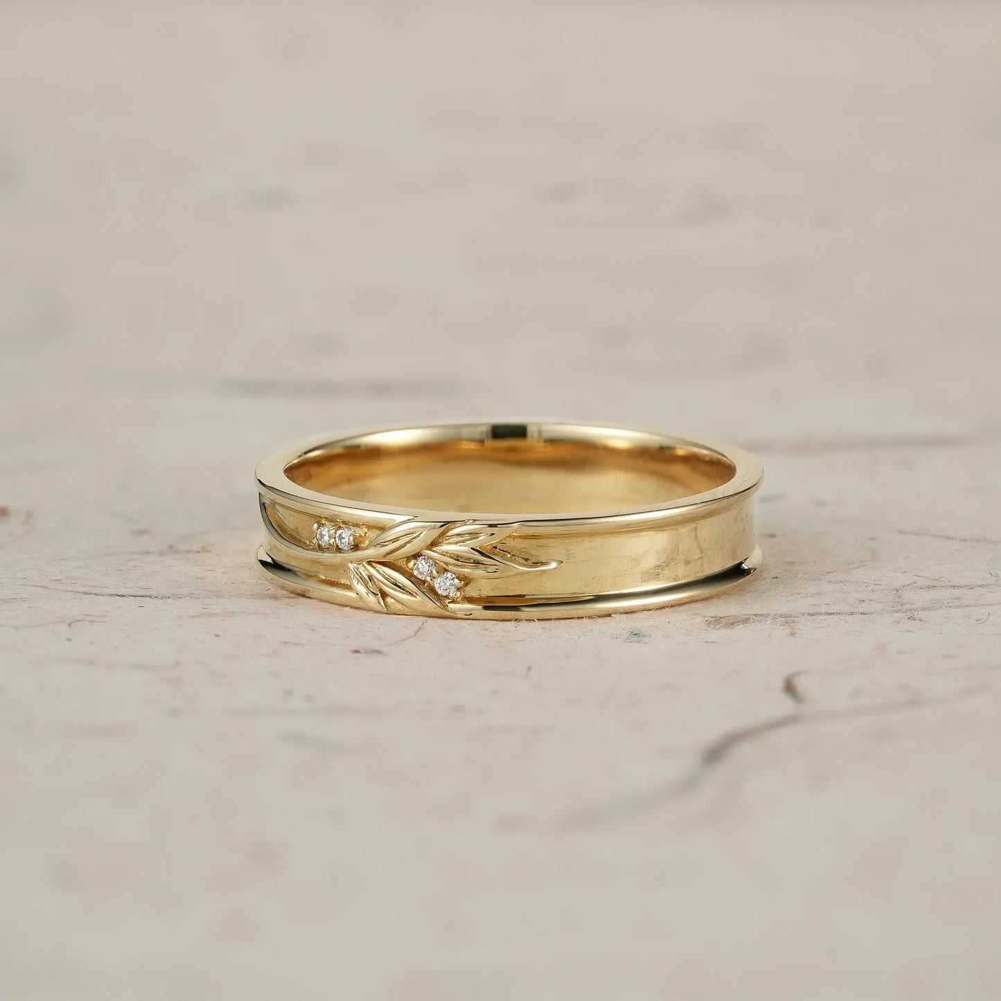 This men's ring showcases a refined gold band with delicate leaf engravings accented by small sparkling diamonds. The subtle design blends nature-inspired elegance with a touch of brilliance, making it a timeless piece.