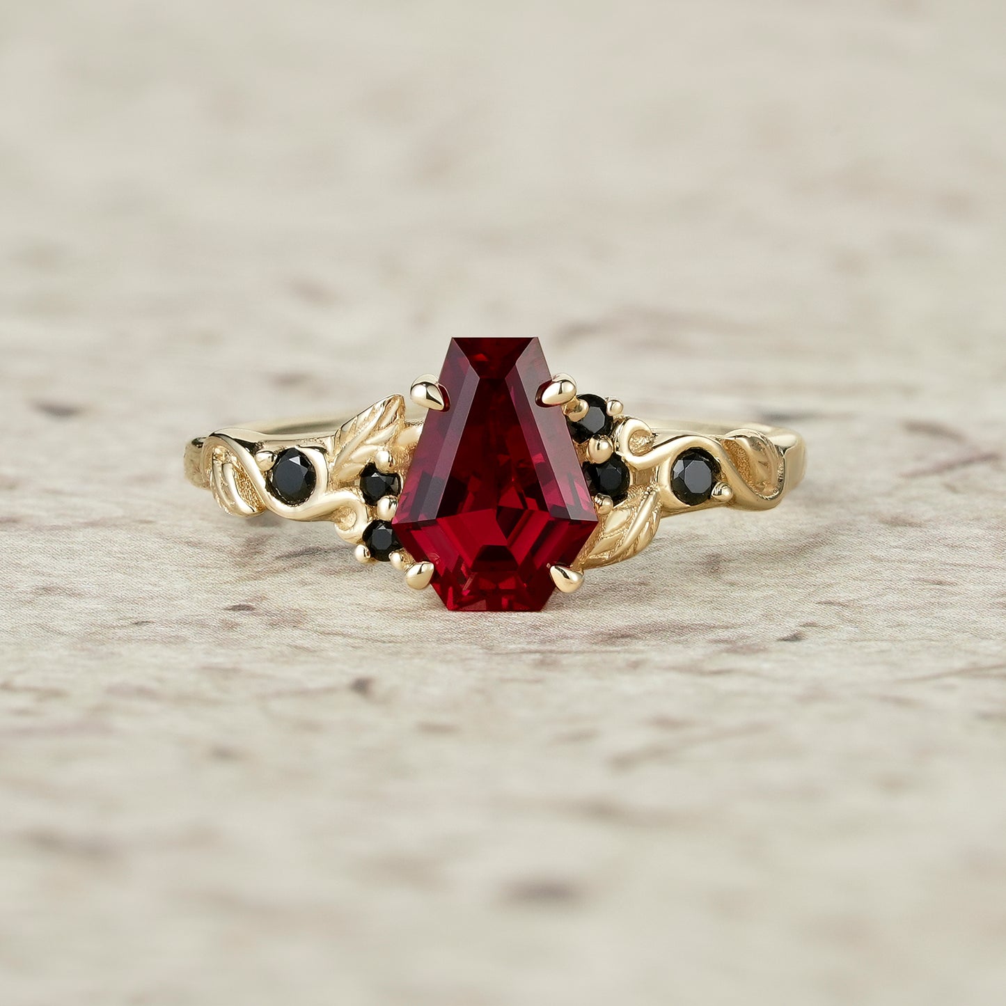This elegant ring features a ruby in a unique coffin shape, set in a delicate gold band adorned with leaf motifs. Black accent stones add contrast, creating a vintage, nature-inspired design.