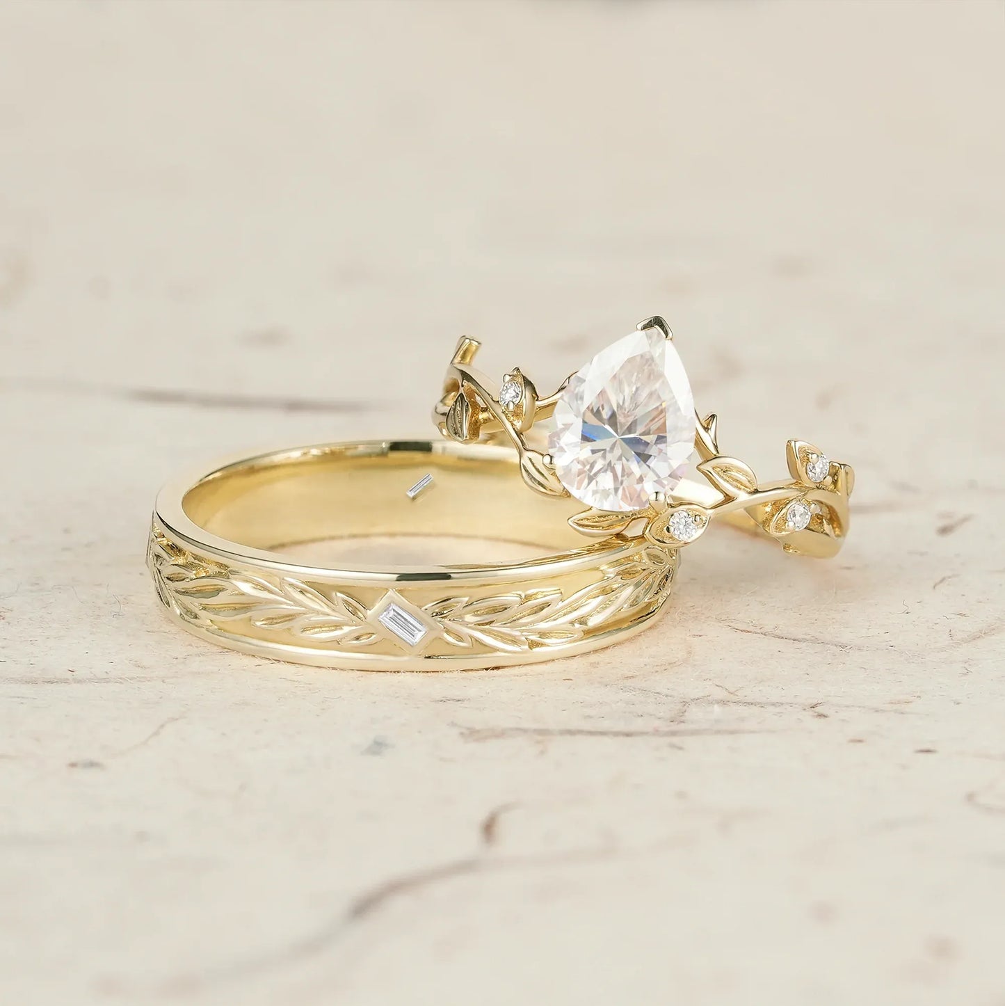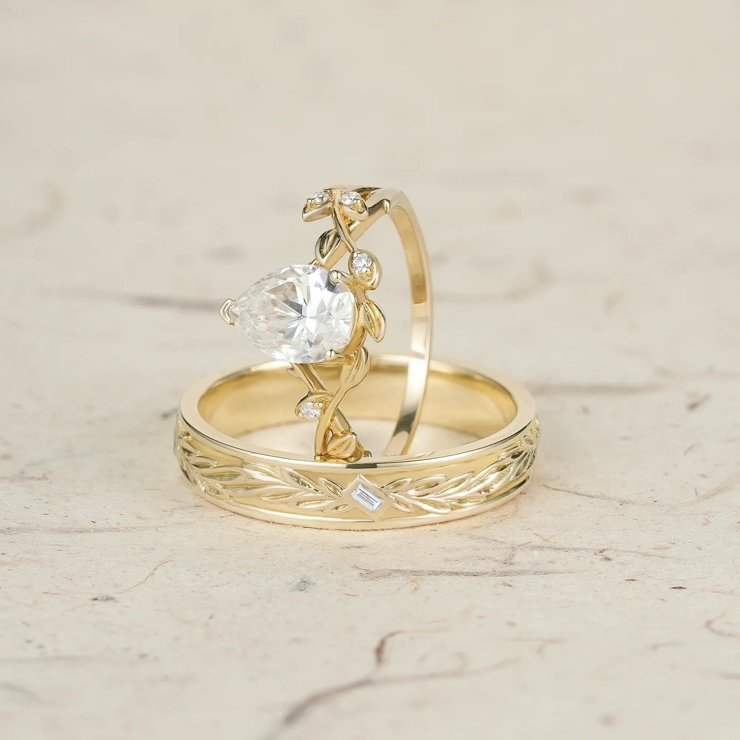 This enchanting couple's ring set features a pear-cut center stone on the engagement ring, embraced by a vine-like band adorned with delicate leaves and diamonds. The matching wedding band showcases an intricate laurel wreath design, symbolizing growth and harmony in lustrous gold, perfect for nature-loving couples.