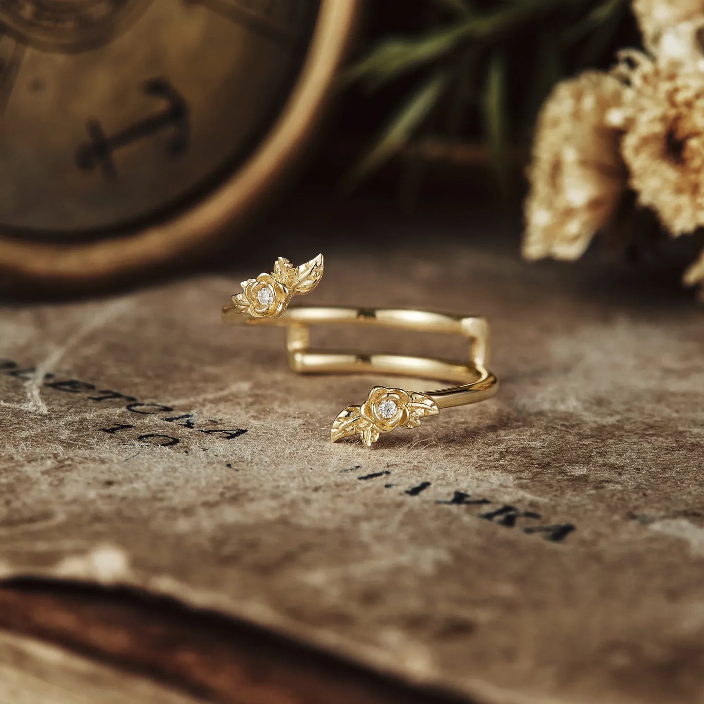 This elegant set of wedding rings features intricate floral motifs on the bands, each blossom meticulously crafted to symbolize love and growth. Made of radiant gold, the rings are accented with delicate leaves and sparkling diamonds, creating a harmonious blend of nature and artistry.
