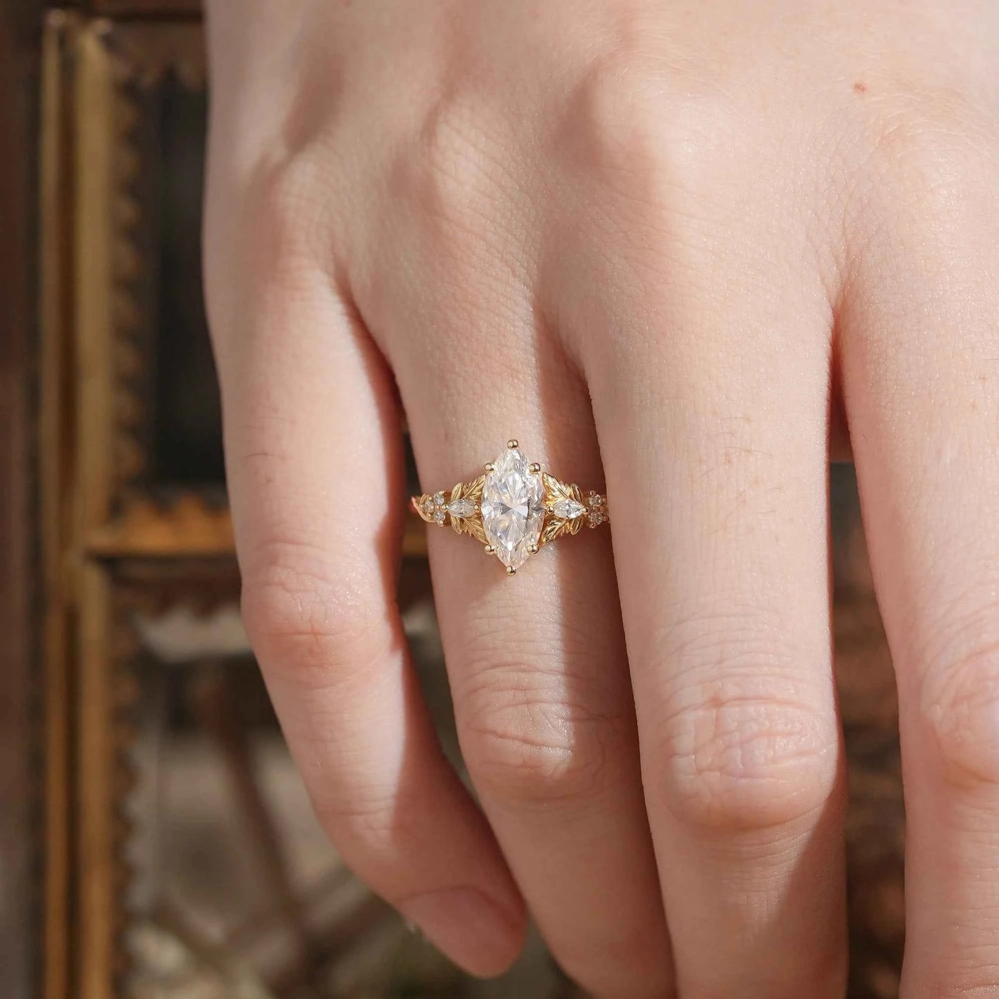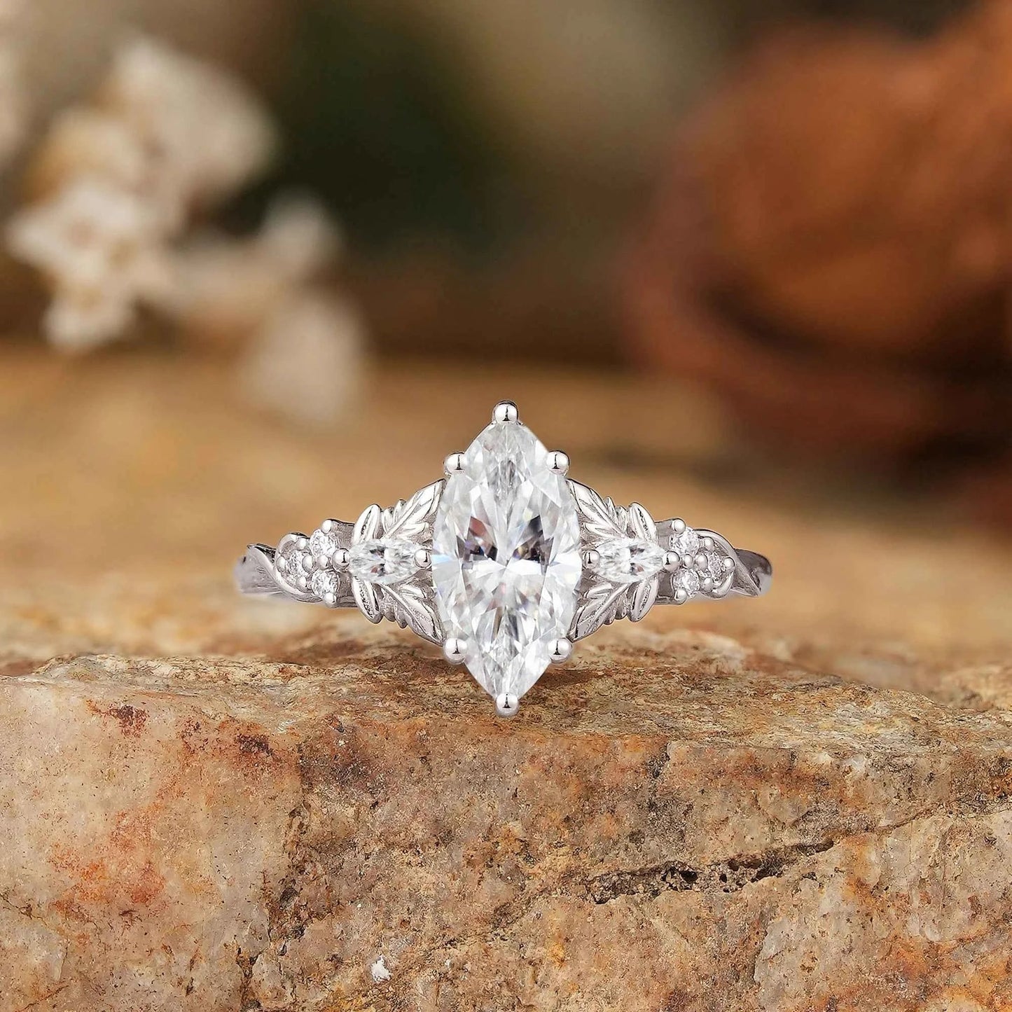 Elegant ladies' ring featuring a marquise moissanite center stone, accented with round and marquise side stones, all set in delicate leaf-inspired detailing. A perfect blend of nature and sparkle!