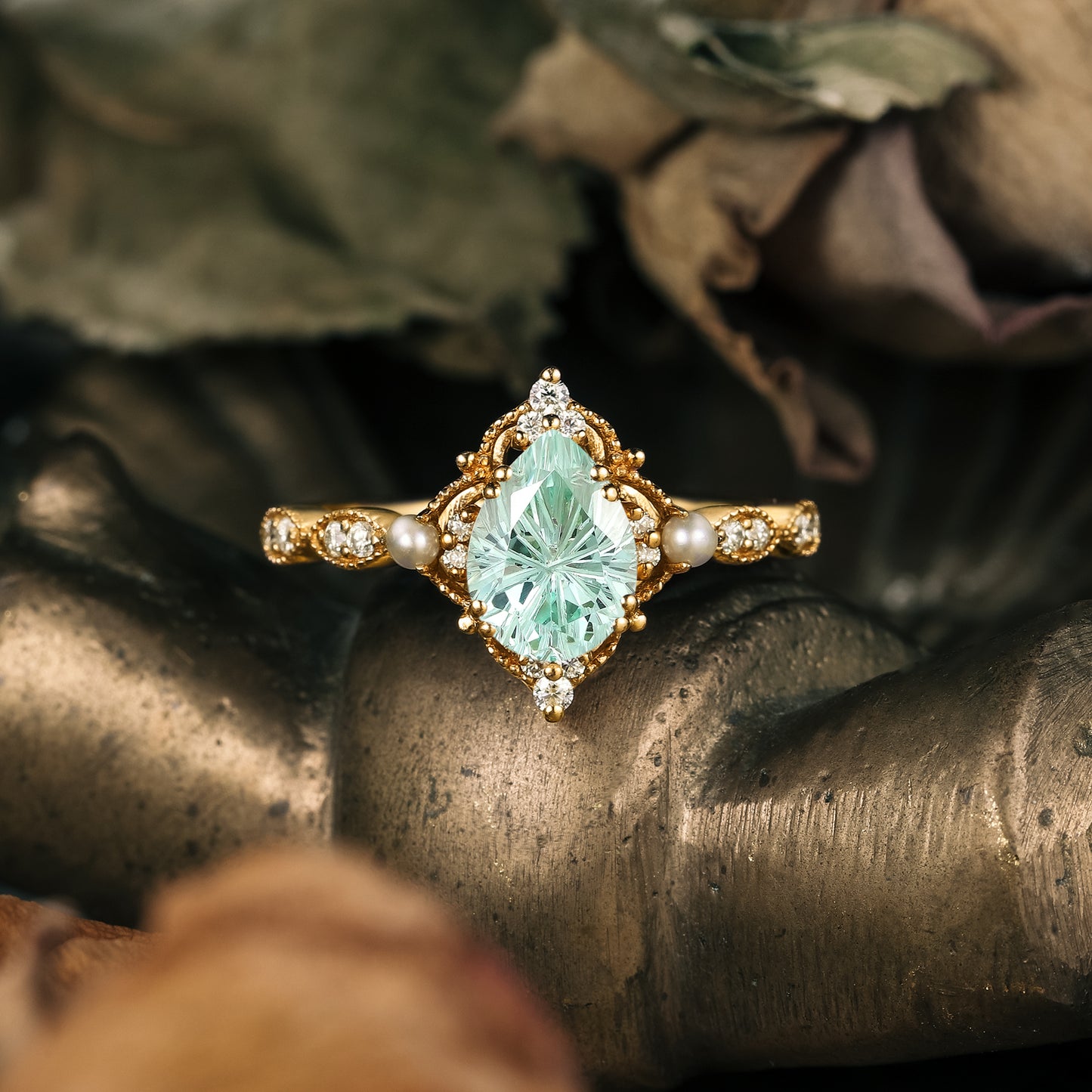 This vintage-inspired engagement ring captures the timeless elegance of enduring love. The centerpiece is a captivating sparkle-cut pear-shaped green sapphire, a stone symbolizing tranquility, growth, and serene renewal. Set within a beautifully detailed band, the sapphire is gracefully complemented by the soft glow of pearls and the brilliant sparkle of moissanite accents. Delicate milgrain edging encircles the design, adding a touch of antique refinement to every angle.