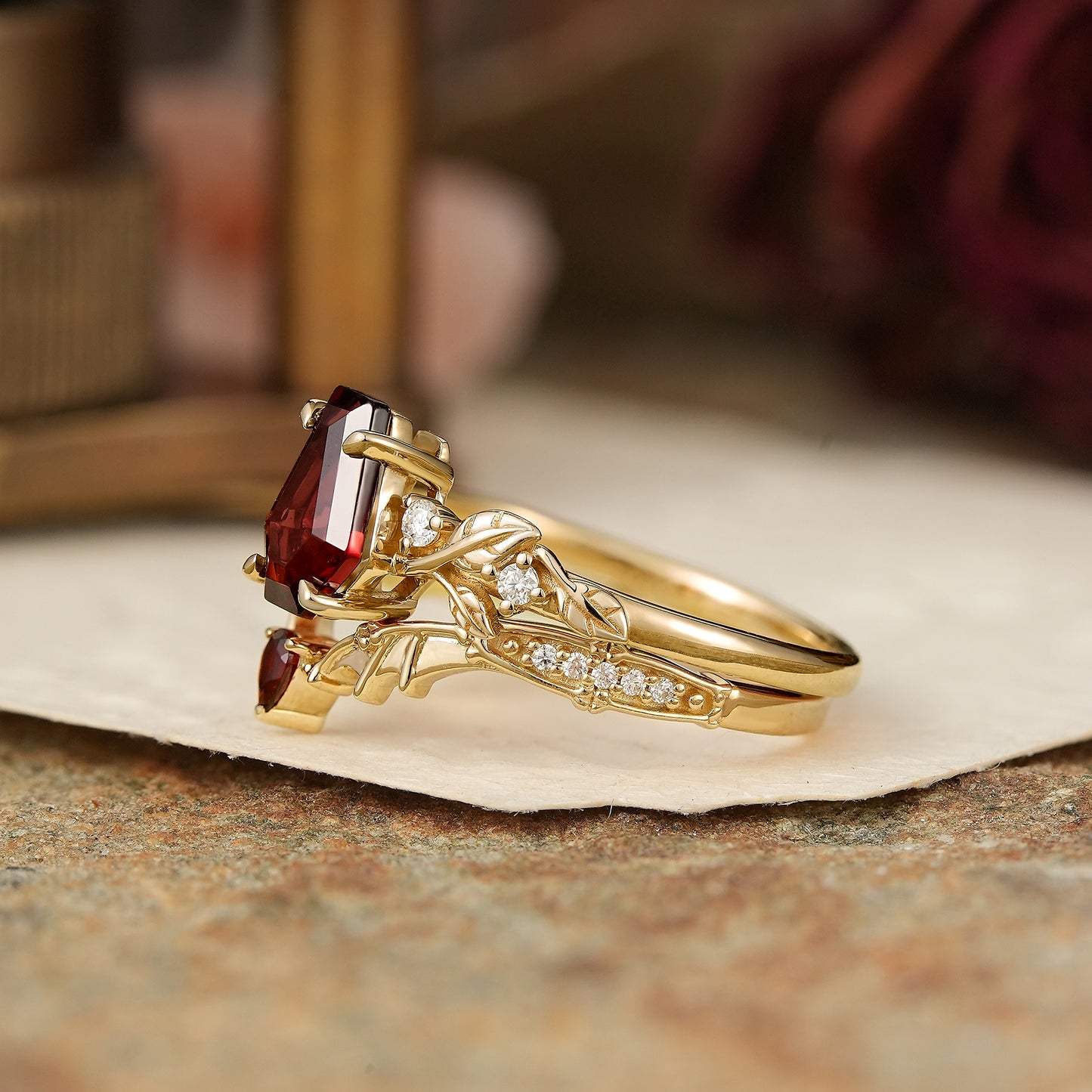 Coffin Cut Garnet Leaf Inspired And Bat Wing Bridal Ring Set - Layla
