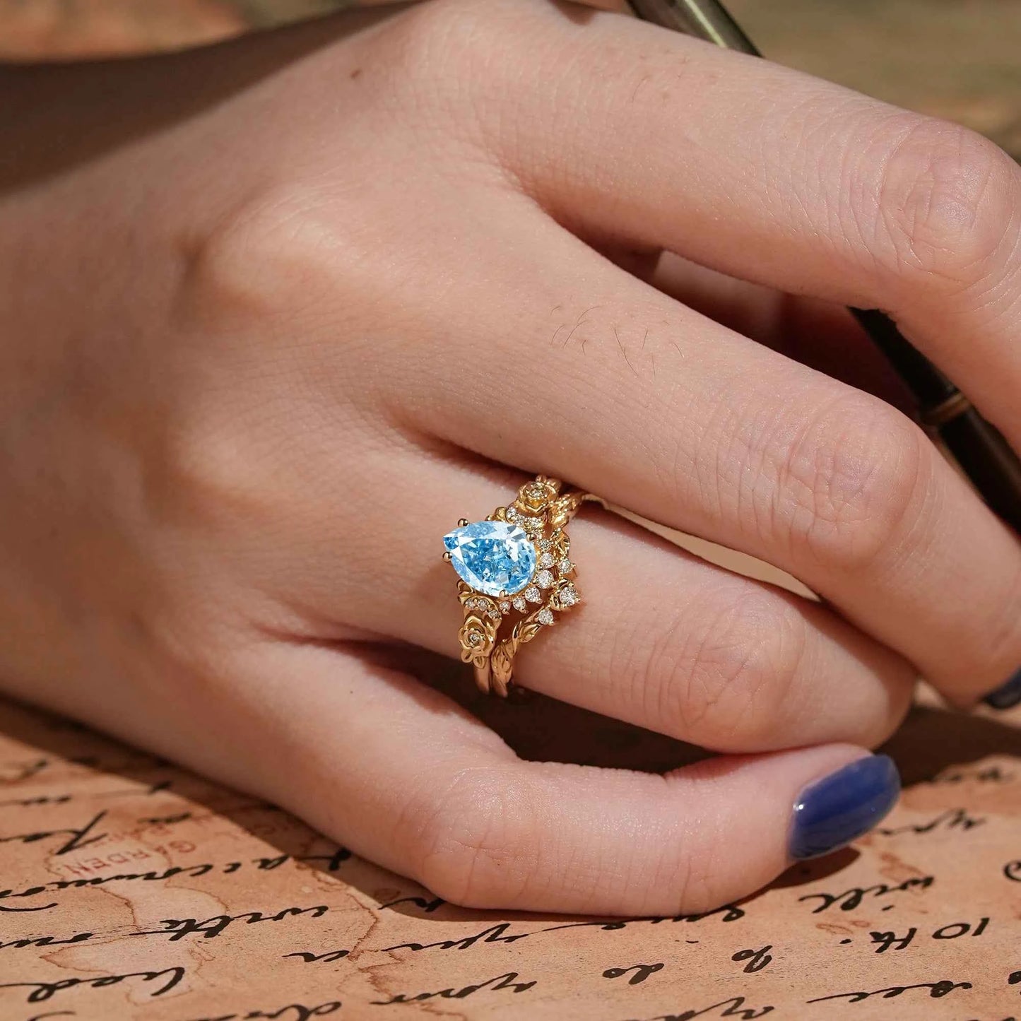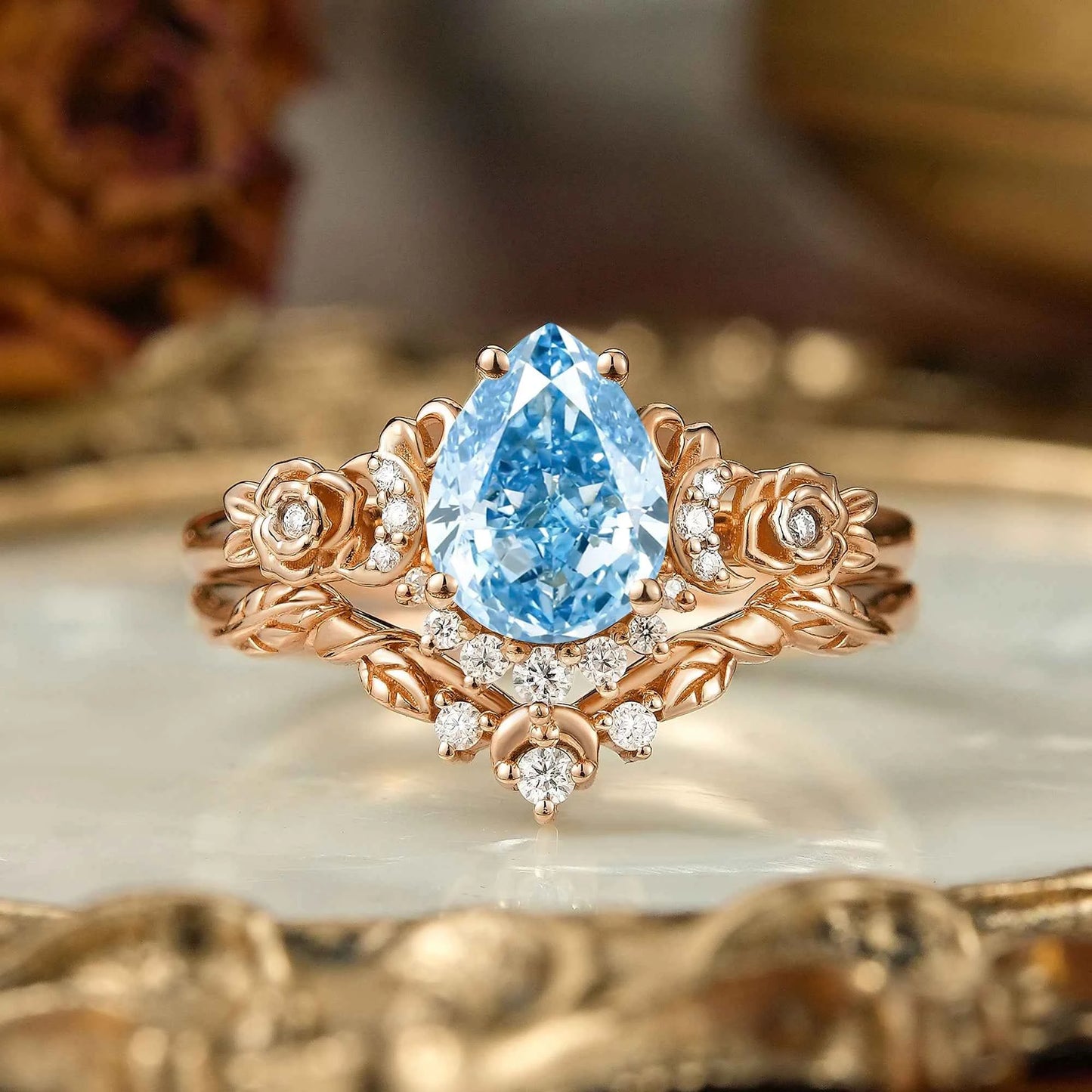 Pear Cut Lab Grown Blue Diamond Moon And Flower Inspired Bridal Ring Set