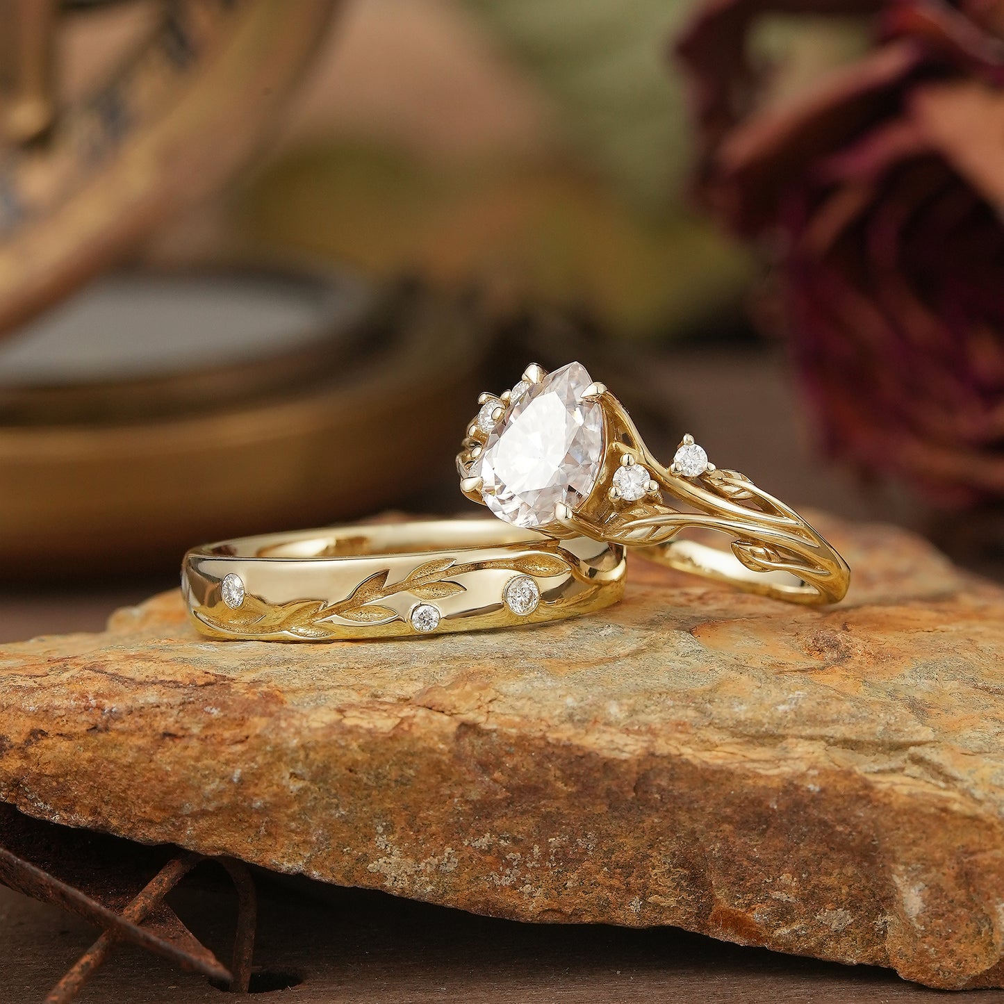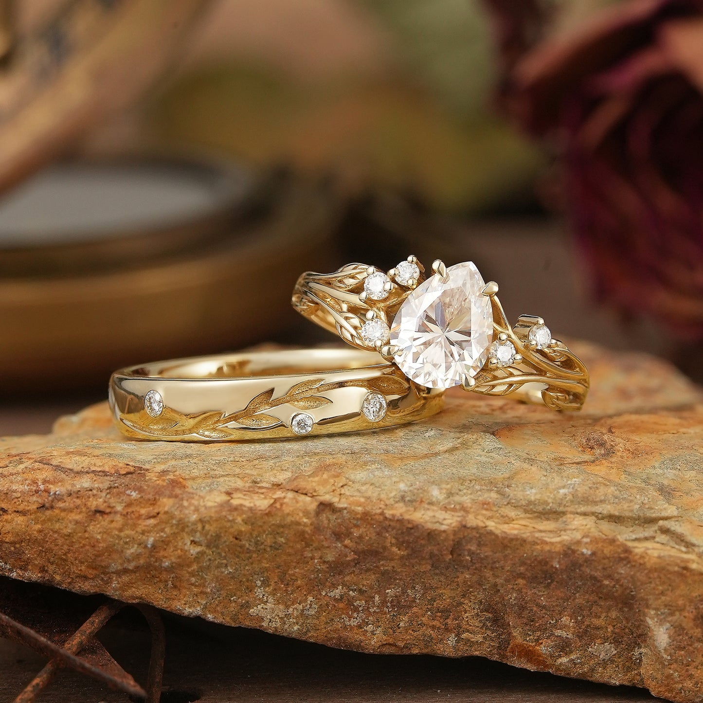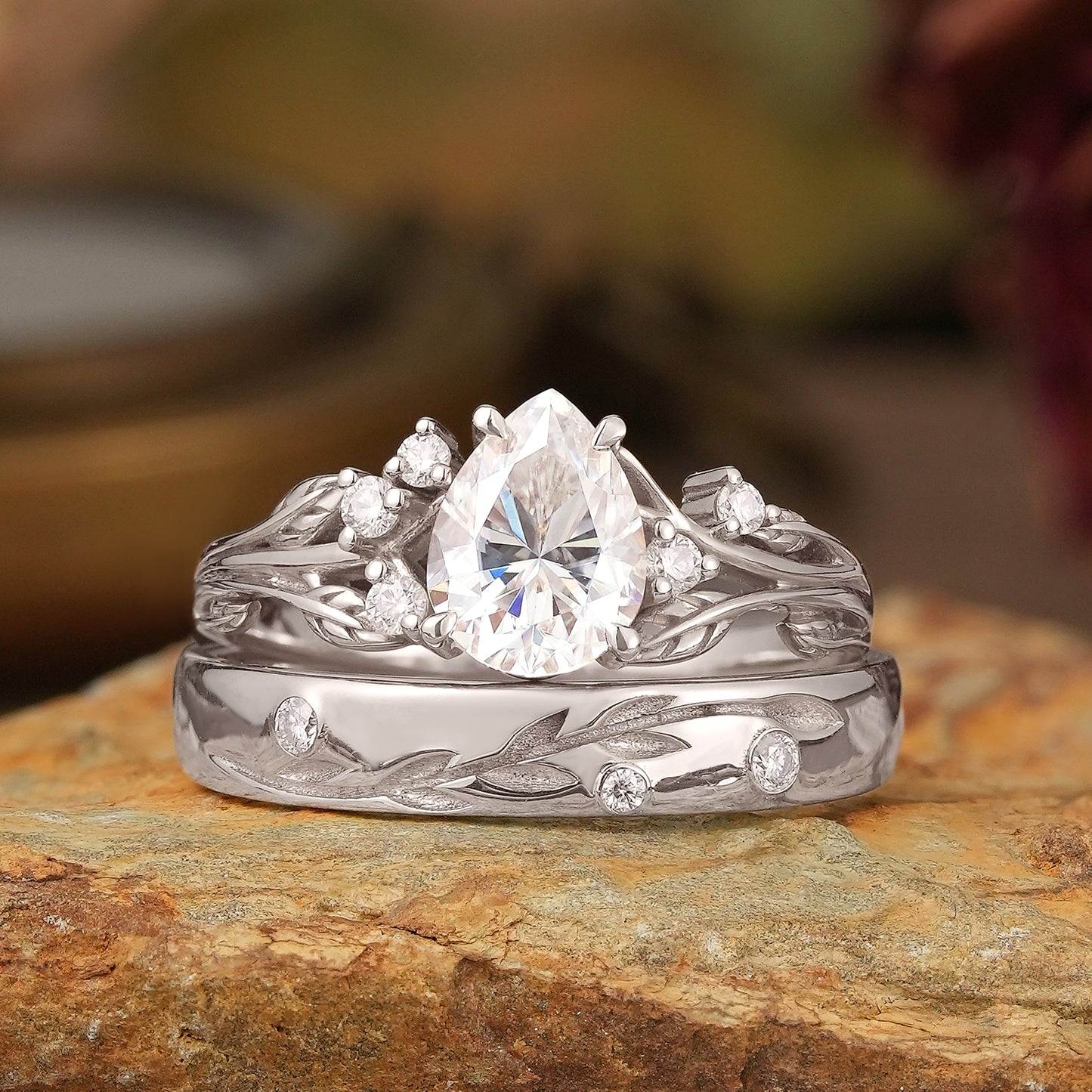Pear Cut Moissanite Leaf Inspired Couple Ring Set - Ayla & Carlos