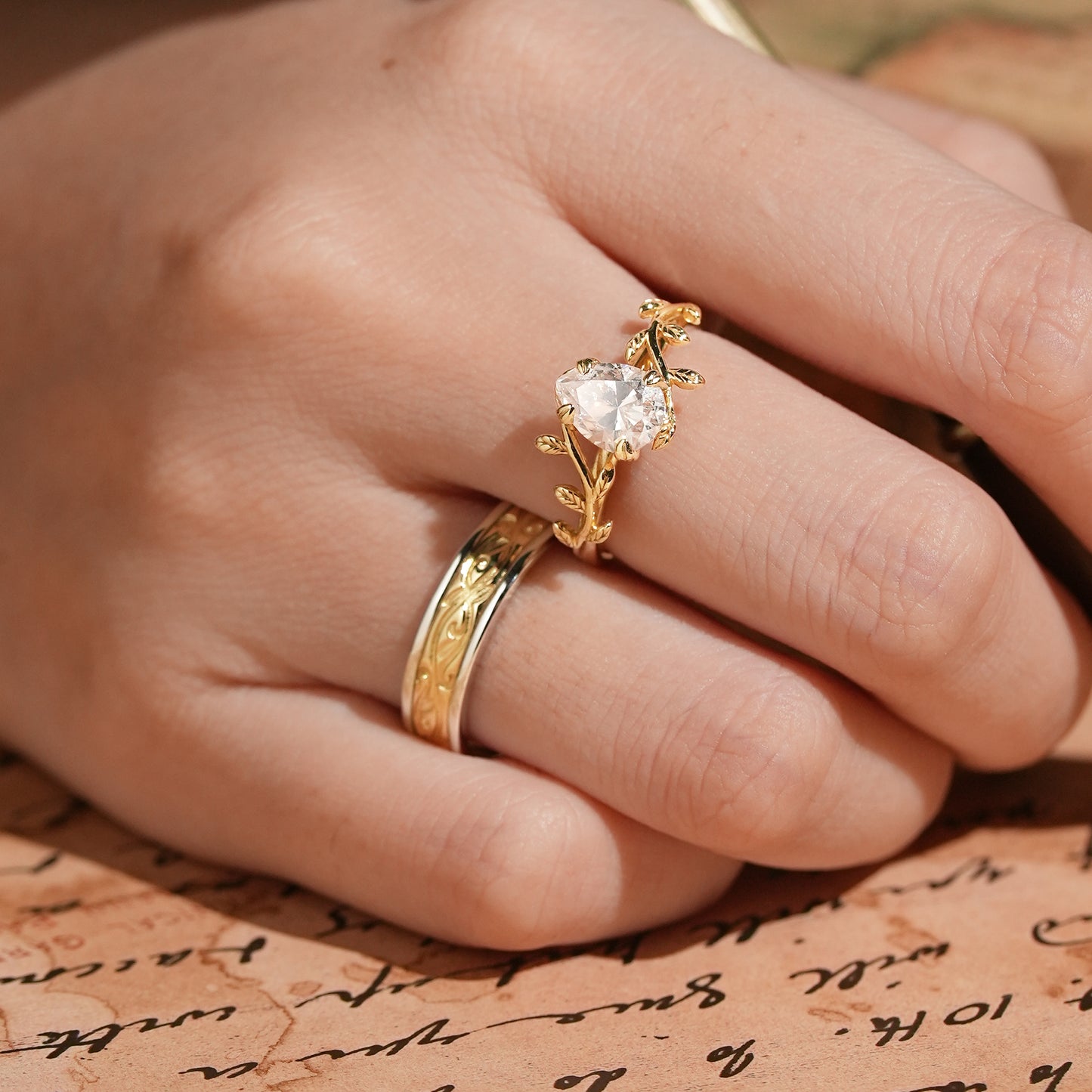 Pear Cut Moissanite Mixed Metal Leaf Inspired Couple Ring Set - Clementine & Moore