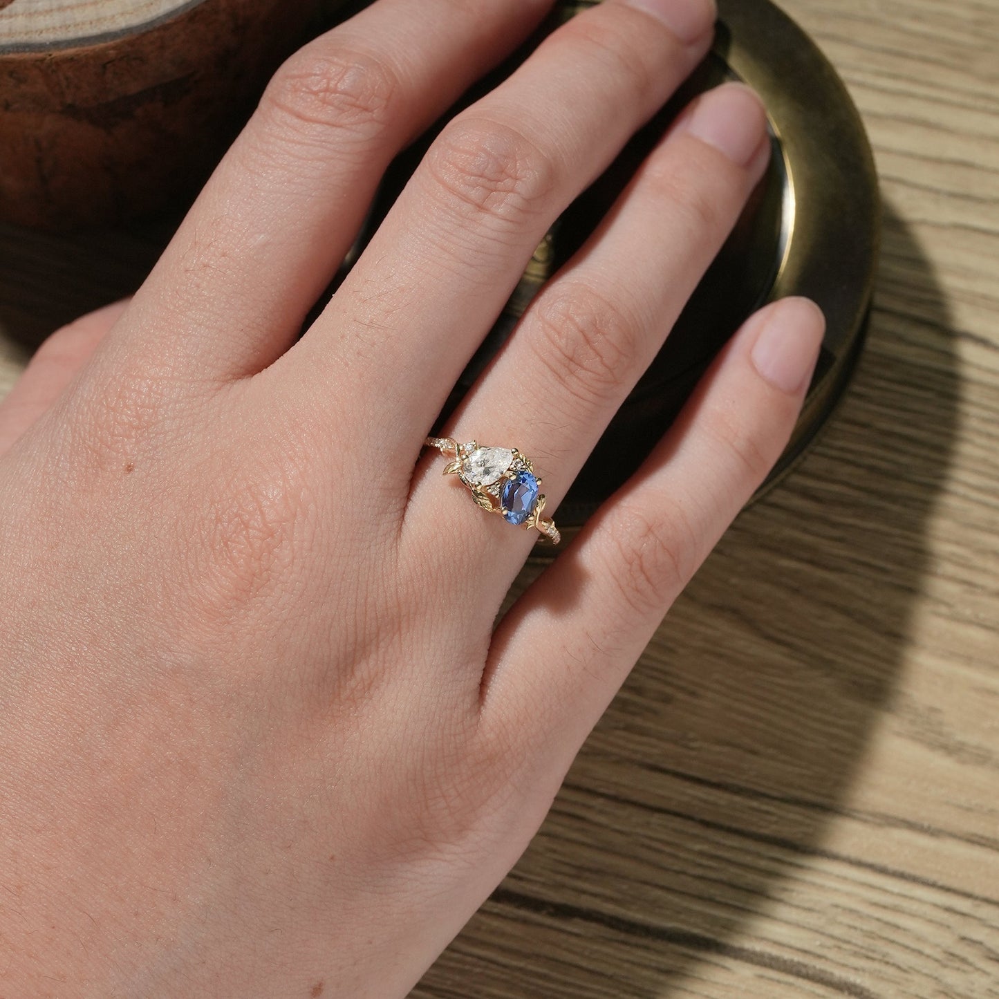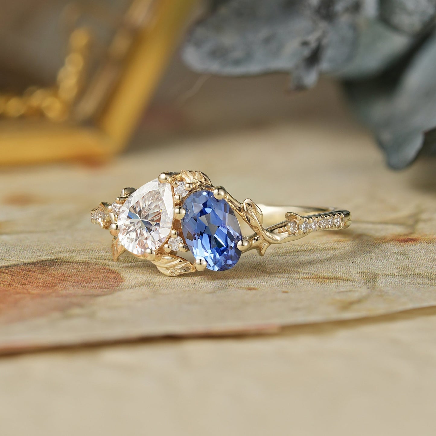 Women's 2 Stone Ring: Pear moissanite & oval sapphire center stones with moissanite accents and delicate leaf motifs.