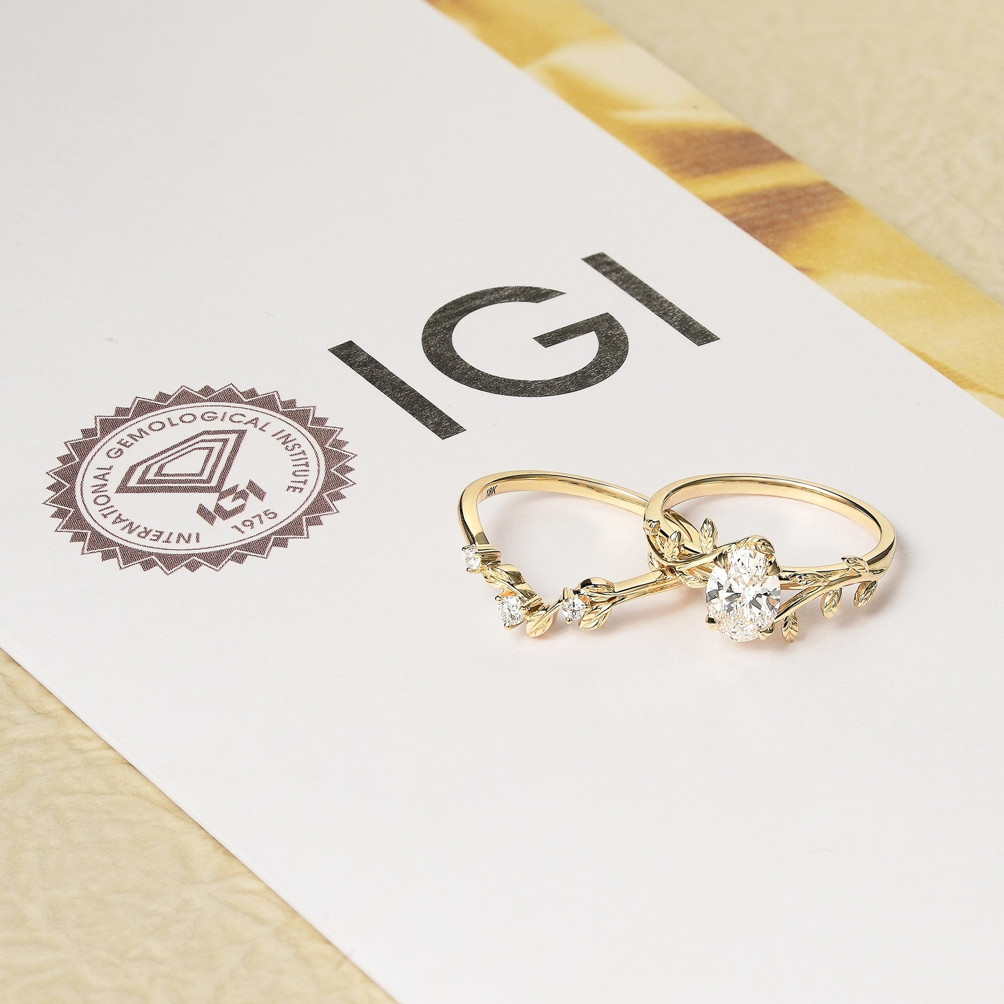 Oval Lab Grown Diamond Half Eternity Leaf Engagement Ring Set 2pcs - Aphrodite