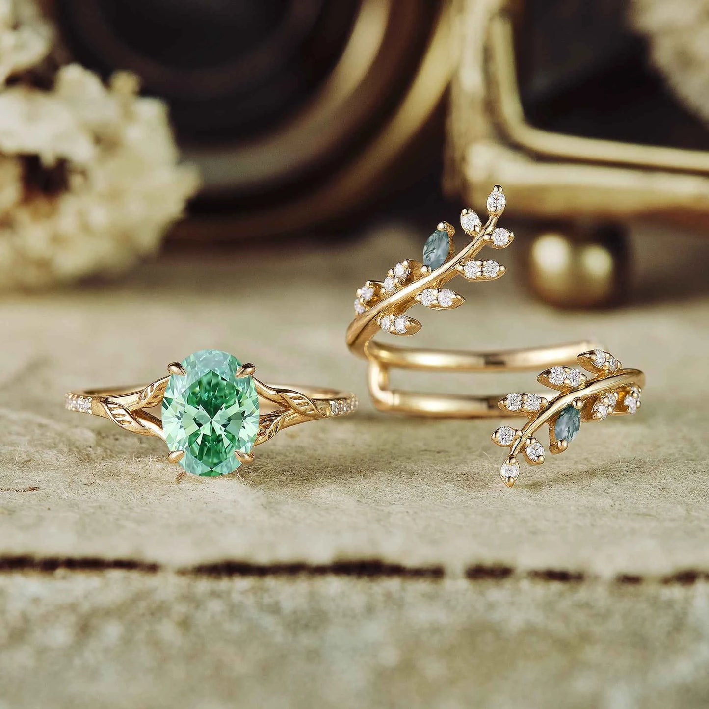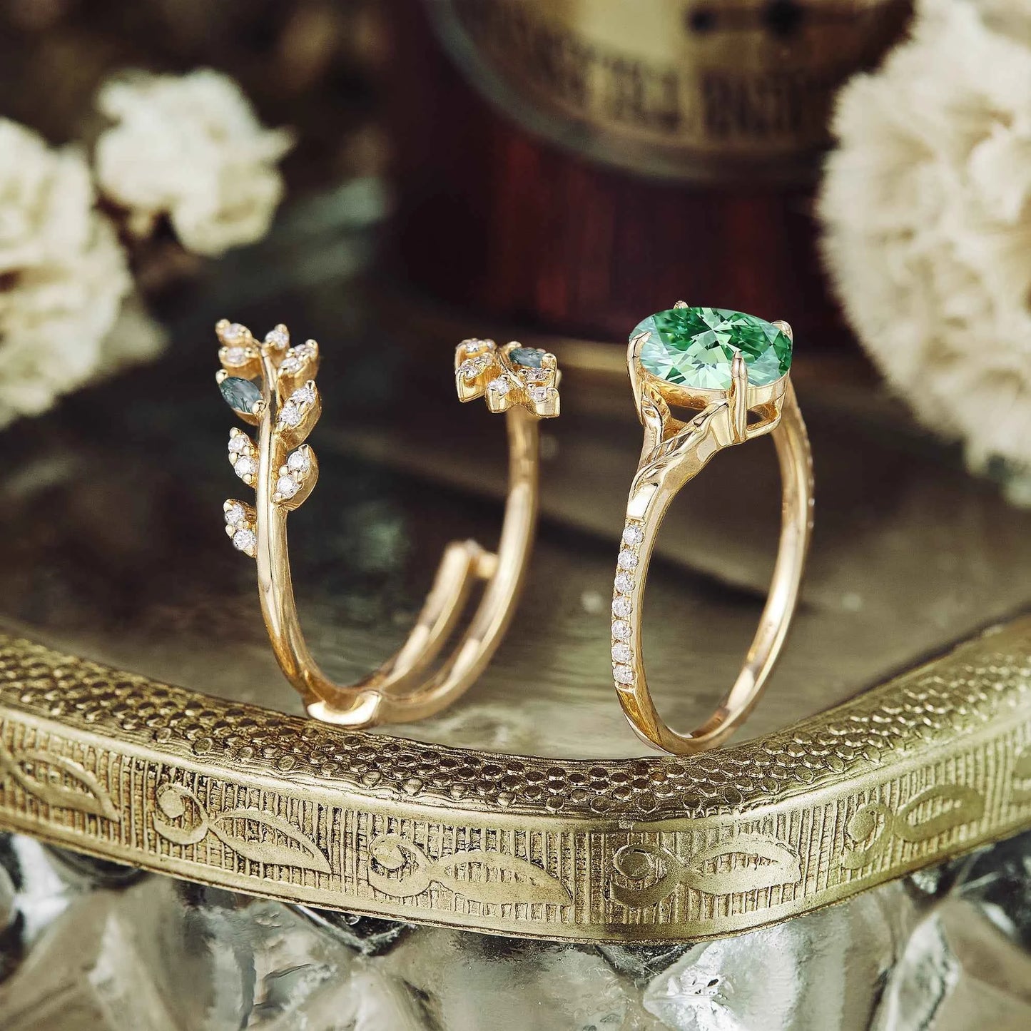Elegant and enchanting, this lab-grown diamond bridal ring set features a luminous oval-cut green diamond embraced by flowing leaf-inspired details. The vivid green diamond reflects renewal and growth, while the ethically created lab-grown diamond symbolizes a conscious and enduring love.