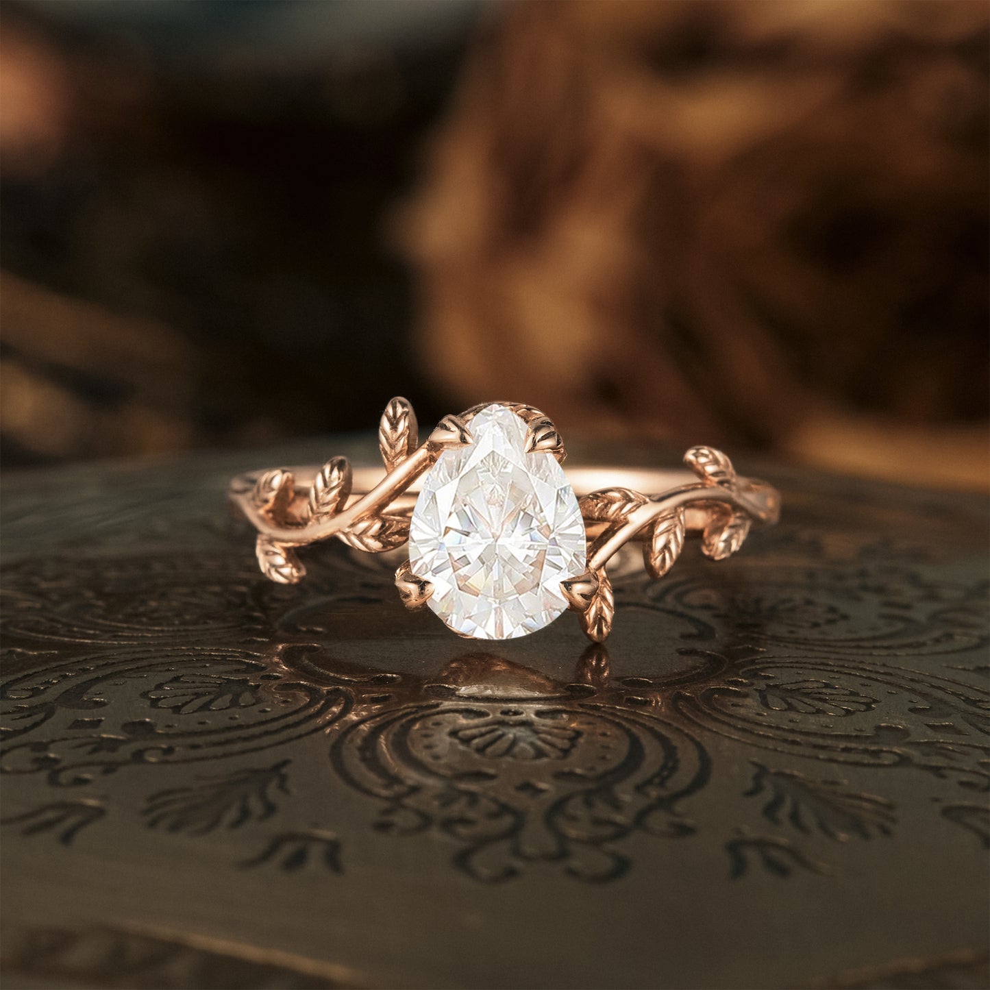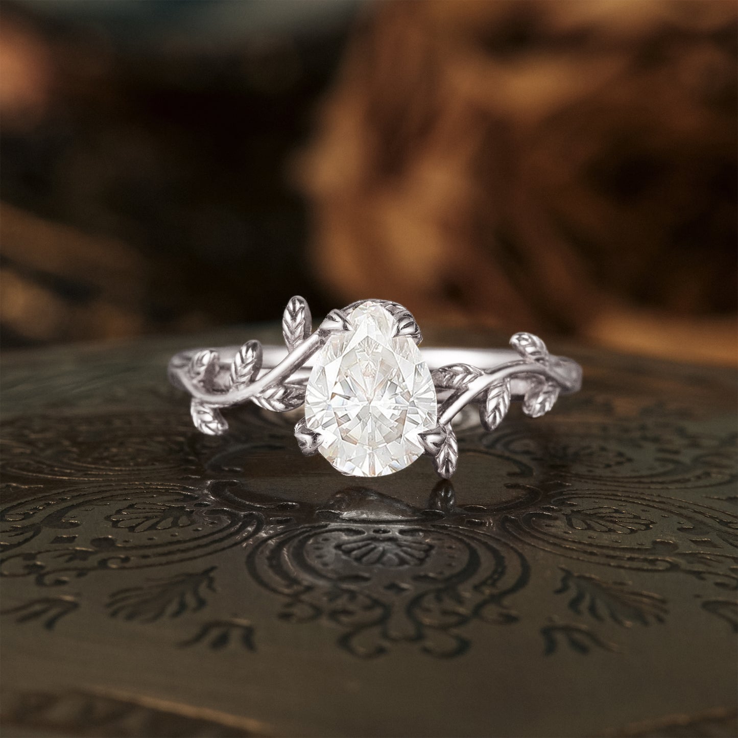 Pear Moissanite Leaf Design Engagement Ring - GemsMagic